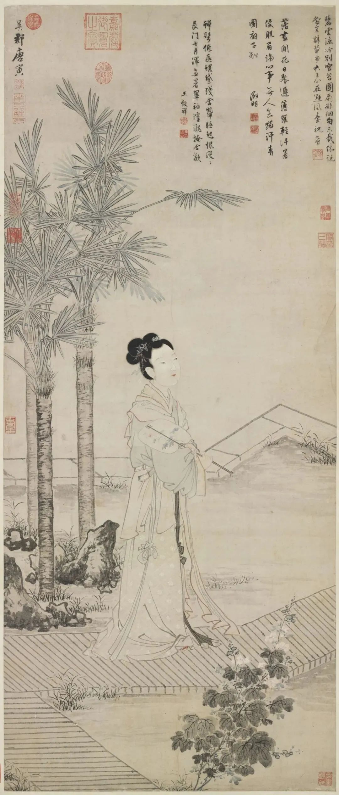 闺怨主题在文学传统中一直受到重视,16世纪之苏州及江南城市中亦有图绘予以表现,然皆作仕女画的模式,以独立之妇女形象表现其幽怨情思,仇英的前辈唐寅即以绘制此类美女图而闻名,其样貌仍可由《班姬团扇》(台北故宫博物院藏)一图见之;仇英以其图绘《汉宫春晓》的精湛画技,自然也是生产这种美人画的最佳人选,传世一幅仇英之《美人春思》便展现了他再现美人柔美情态的高度能力,那即使是唐寅亦不足与之抗衡。然而,如以楼阁远眺与这种美人画并列,新旧之别立判。作为仇英新古典的闺情山水不仅是闺怨古典主题的新表现,从山水画的立场上看,它也开发了一个崭新的表现主题。