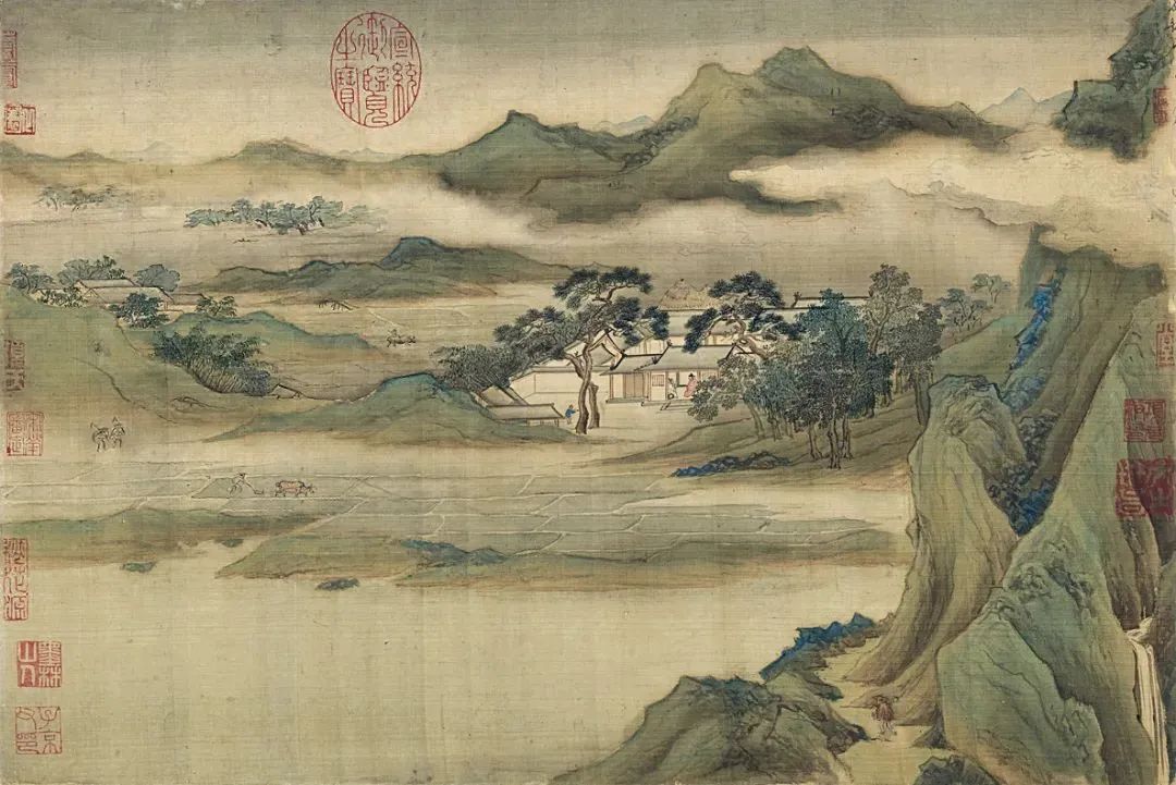 明 仇英 《临宋元六景》册之《夏景》 1547 年 册 绢本设色 29.3 厘米 ×43.8 厘米 台北故宫博物院