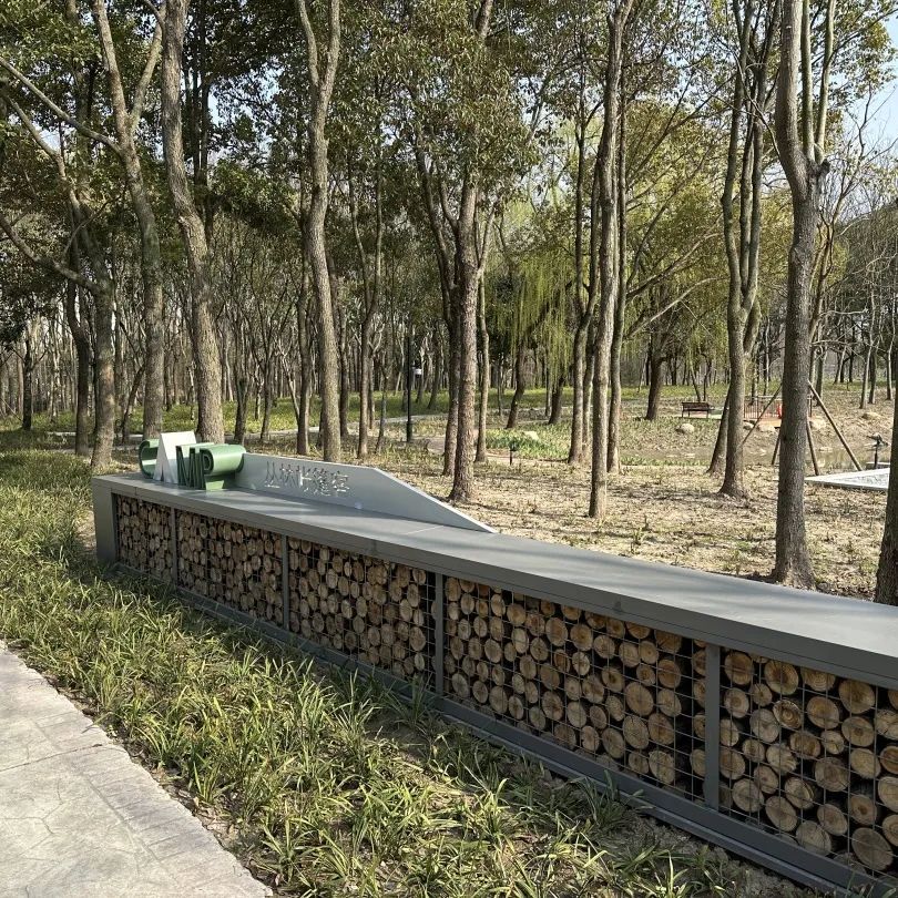 园内景墙和坐凳用铁丝做网、原木填充,你知道为什么这么做吗?答案是,这样设计既生态环保,又为小动物和昆虫们提供了许多的“家”。小朋友们可以在此寻找小动物和昆虫们的身影~