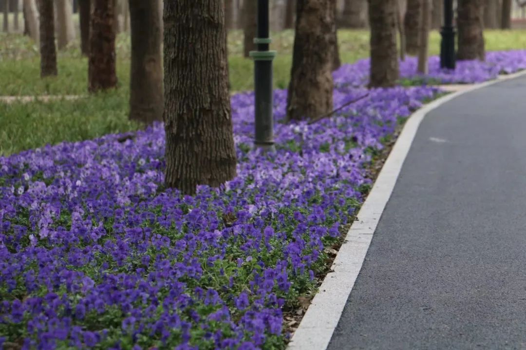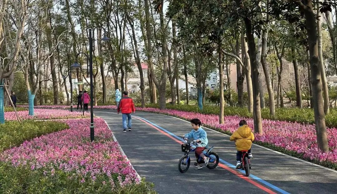 长达1公里的多彩绿道有代表唐镇九球文化的九色花带。