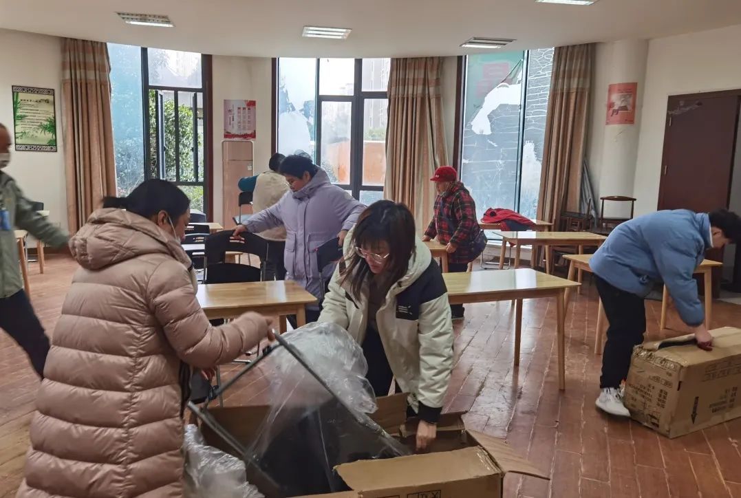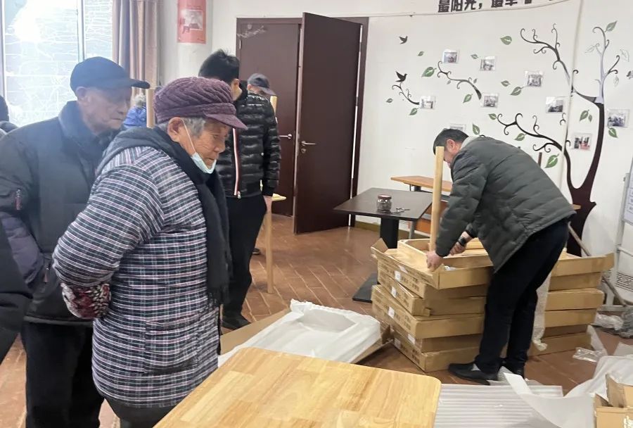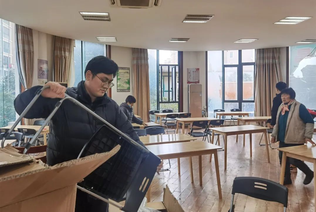 春日初醒,万象更新。近日,南桥镇庙泾村联合南桥镇曙光村、金海苑居委将南桥镇金海苑睦邻“四堂间”进行内部设施大换新,进一步提升辖区内居民的活动环境,满足老年群体的文化活动需求。 金海苑睦邻“四堂间”开设十余年期间,不仅解决了庙泾村、曙光村行动不便老人的烧菜难题,给“老宝贝们”搭建了调节心情的沟通平台,更有效缓解了老年人家属、子女看护老人的时间压力。“老宝贝们”经常相聚在“四堂间”一起聊家常、嘎讪胡。 随着时间推移,不少老人向庙泾村、曙光村、金海苑居委反映“四堂间”内桌椅出现磨损、“缺胳膊少腿”等问题,村居干部想居民所想,急居民所急,仔细地检查“四堂间”内所有桌椅,将晃动、存在安全隐患的桌椅搬离。经协商讨论并听取居民建议,一致决定将“四堂间”内桌椅全部换新,给“老宝贝们”提供一个更舒适、安全的就餐、活动空间。 庙泾村、曙光村及金海苑居委也在本次换新大改造中进一步细化了“四堂间”的管理责任划分、活动开展、环境卫生、餐费收取等相关工作。 忙碌的身影、“闹猛”的氛围,“银发族们”迫不及待地在窗口张望,好奇地与志愿者打探着:“什么时候换新好呀?我们每天都会来这里休闲娱乐,现在真是越弄越灵了呀,为“阿拉”老百姓考虑得越来越周到了!” “我来帮忙扫地咧!”居民王阿姨热心地前来助力,“真的很感谢你们,给我们提供这么好的休闲环境,我们心里暖暖的!”搬走旧桌椅、新家具拆箱、打扫卫生、精心布置……志愿者和前来帮忙的居民们齐心协力,不出半天,整个“四堂间”便面目一新,每个人脸上都洋溢着笑容。 金海苑睦邻“四堂间”开放时间 周一至周日8:00~15:00 辖区内符合就餐条件的老人 可前往“四堂间”联系 庙泾村高阿姨、曙光村李阿姨订餐 金海苑睦邻“四堂间”不仅为老年人 提供新鲜可口的暖心午餐 亦能化身“老宝贝们”的第二个“家” 倾心交谈、闲话家常、排解寂寞