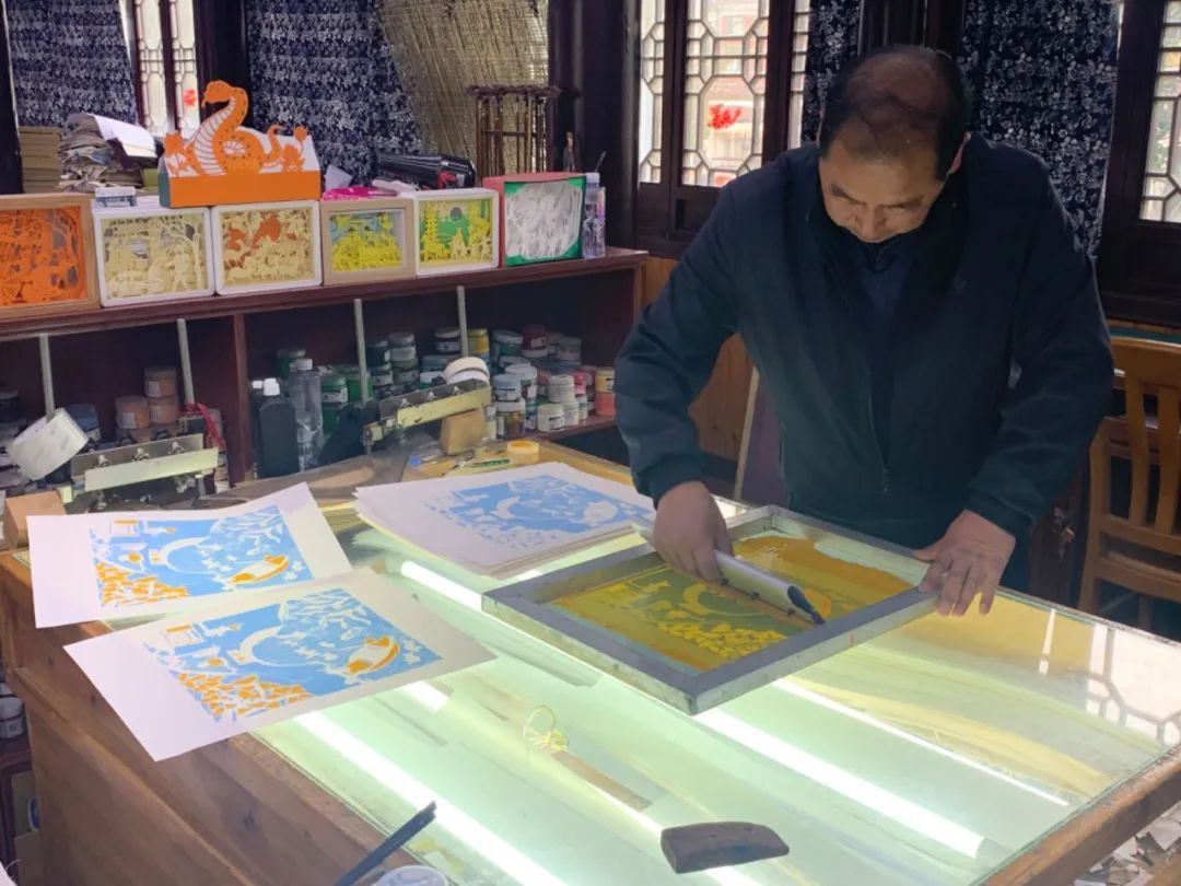 为了进一步了解丝网版画的创作过程,记者来到1公里外的车墩镇丝网版画创作基地。宽敞的创作室里,除了创作台面不得不空出来,其余地方均被一摞摞画稿、一幅幅作品塞得满满当当。画师们正忙着绷网、刮浆、晒版、调色……就在这一道道繁复的工序中,作品也一点点进行着蜕变。