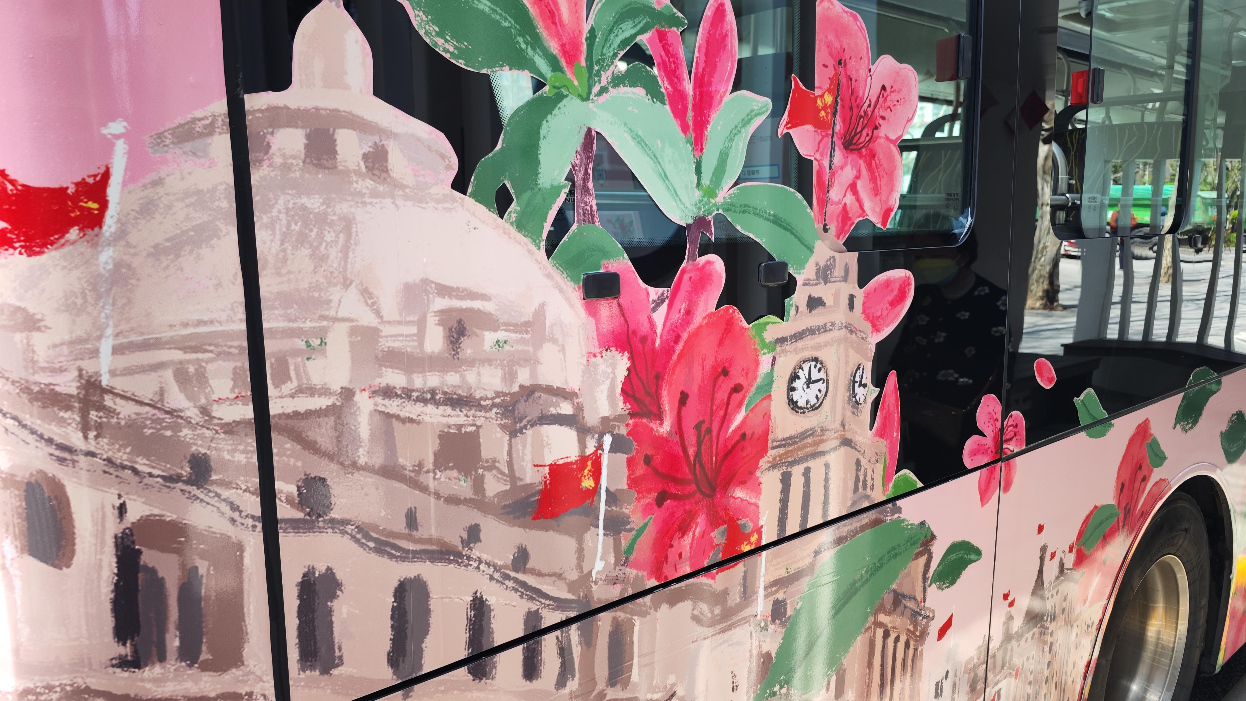 记者在公交926路终点站看到了花朝节定制班线,配合鲜花的主题,整个车身外部全部贴上了彩绘贴膜,926路以杜鹃花为主题,上面还印有外滩的风景建筑,整体呈现粉色调,十分吸睛,开在路上本身就是一道风景线。