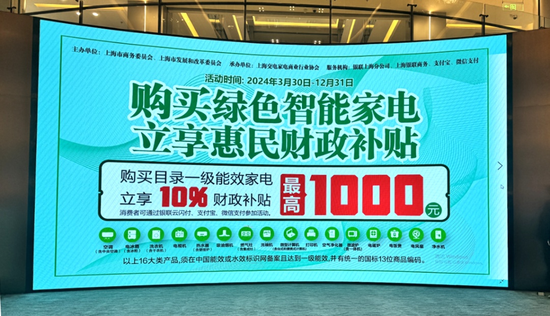为进一步推动绿色消费,充分释放绿色智能家电消费潜力,普陀区商务委全力推动区内相关企业开展绿色智能家电消费补贴活动,积极响应上海市新一轮绿色智能家电消费补贴政策。3月30日,在普陀区红星美凯龙上海全球1号店,绿色智能消费补贴正式启动。自即日起,市民在商场内购买16大类一级能效家电均可销售成交价格的10%的一次性立减补贴,补贴金额不超过1000元。