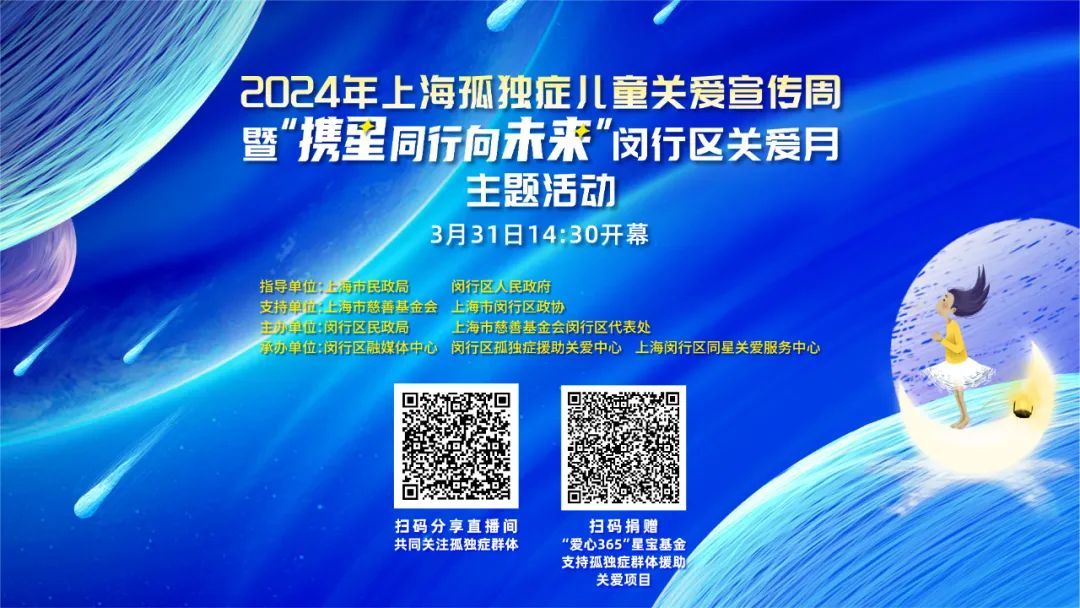 在第17个世界孤独症日来临之际,为呼吁和倡导社会各界关爱帮扶孤独症儿童,由上海市民政局、闵行区人民政府指导,上海市慈善基金会、闵行区政协支持,闵行区民政局、市慈善基金会闵行区代表处主办,闵行区融媒体中心等承办的2024年上海孤独症儿童关爱宣传周暨“携星同行向未来”闵行区关爱月主题活动,将于3月31日在闵行文化公园慧音蓝屋拉开帷幕。