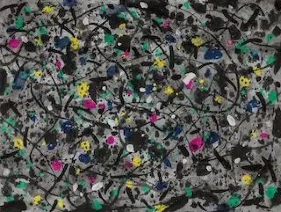 作品以点、面构成了一幅抽象的艺术世界。画面中的黑白色块相互交织奠定了基础,紫色、黄色、红色和蓝色的色点与色块以活跃的形态随意点缀。这些看似随意的色点与色块,浓缩了吴冠中对形式的概括与感悟。所有的具象都已化作抽象的元素,展现出一种律动和气韵。吴冠中以点、线、面的基本形式探索抽象的表达,此作主要追求“面”构成的艺术效果。从具象到抽象,吴冠中以自己的实践不停地探索,到晚年他以极为简练、概括的形式表达最本质的艺术情感,追求中国画现代化之路。