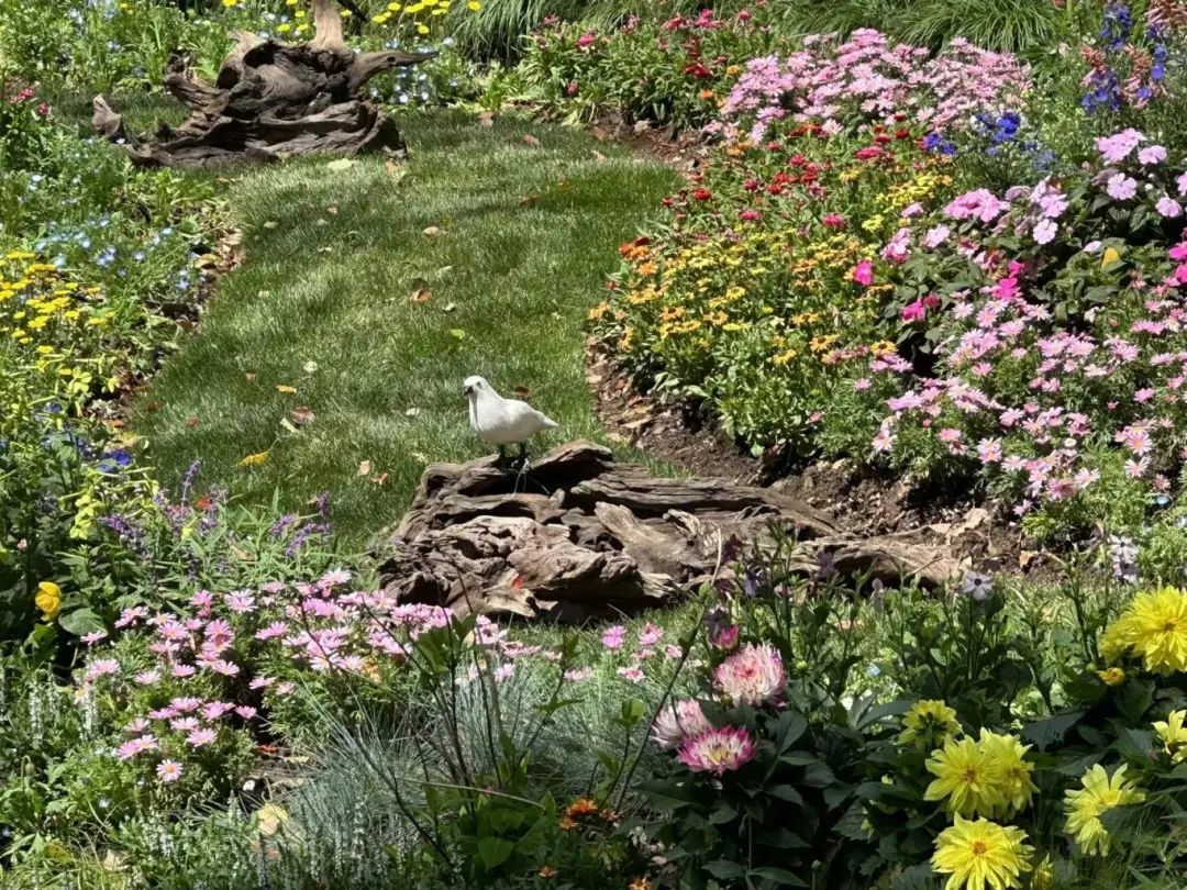 要说最值得打卡的点位,那一定非“莫奈花园”特色景点莫属。展区位于花艺馆两侧河岸,规模较往届相比有所扩大。以公园水环境为依托,河岸布满了以蓝紫色系为主混植的精美花境,仙鹤、獐子等小品点缀其中,别有一番风味。