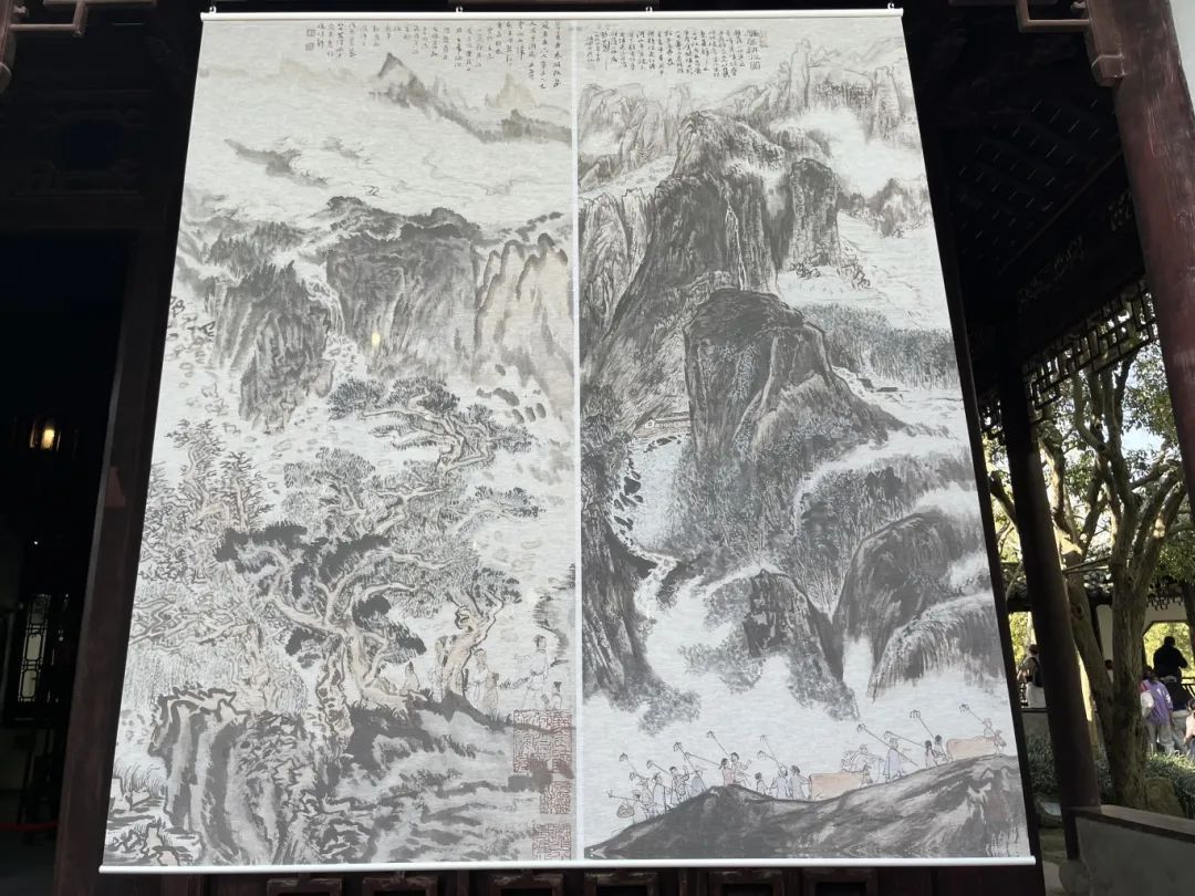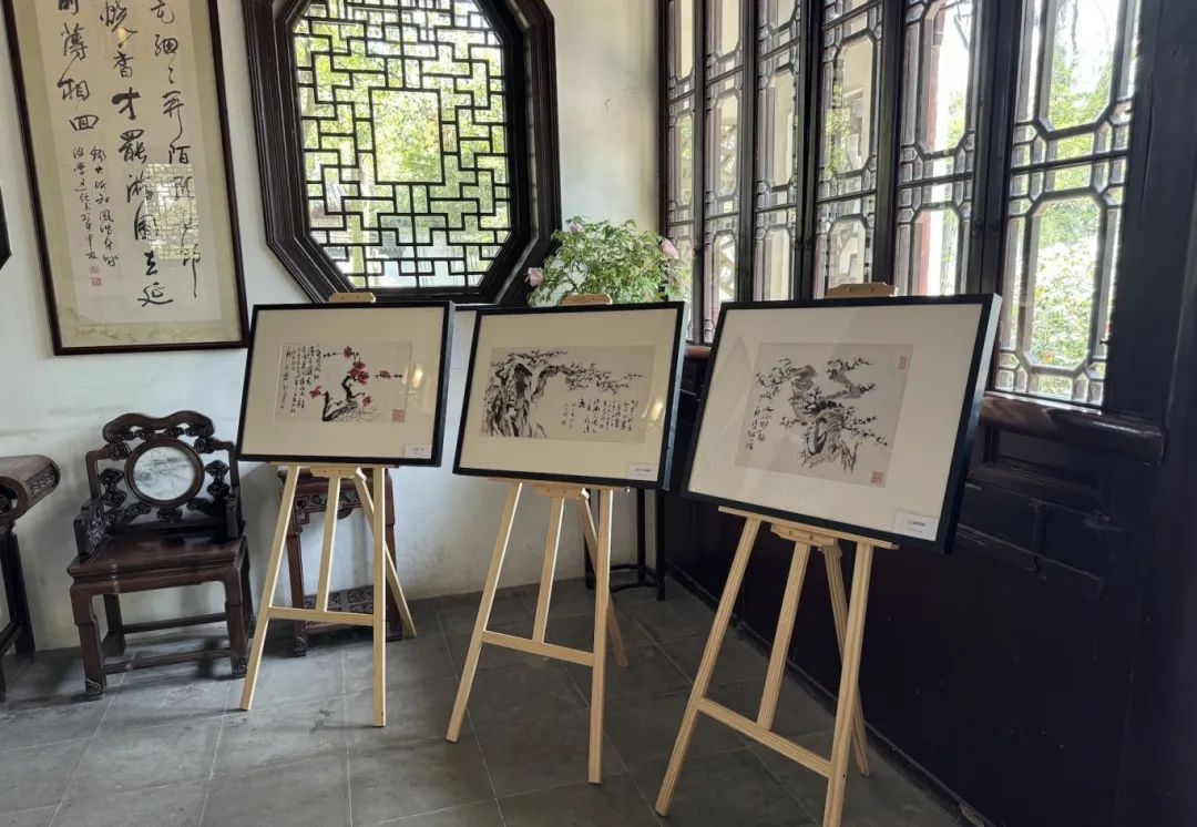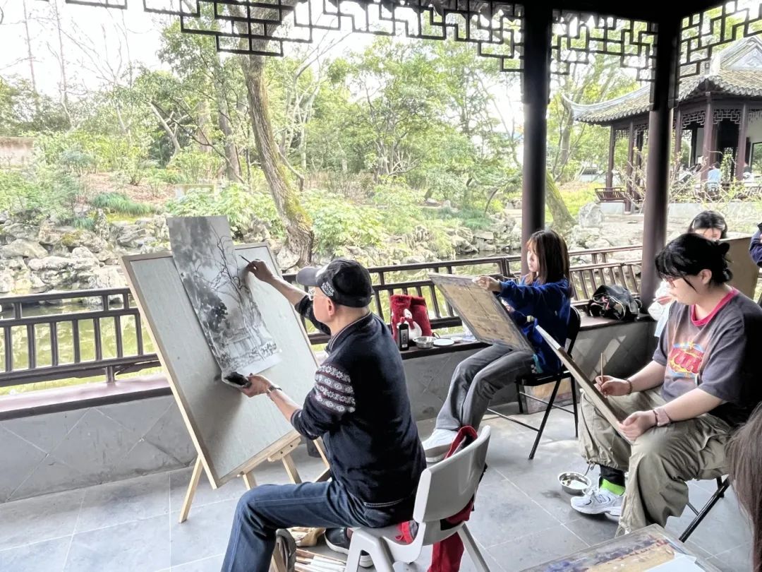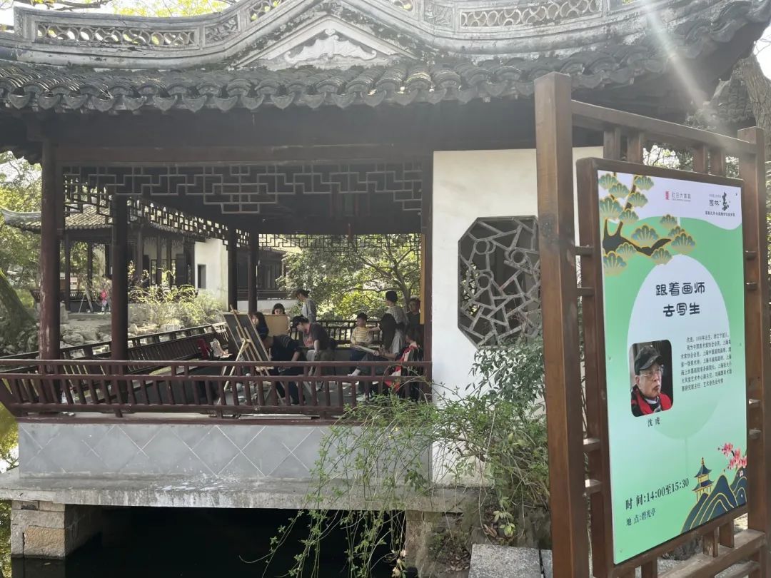 这边正沉醉于对陆俨少作品的赏析中,那边已经开始了写生之旅。来自上海中国画院的画师王漪、沈虎、季平分别在凝霞阁、碧光亭、舟而不游轩支起画架。他们或凝神观察,或挥毫泼墨,将眼前的景色一一转化为纸上的笔墨丹青。