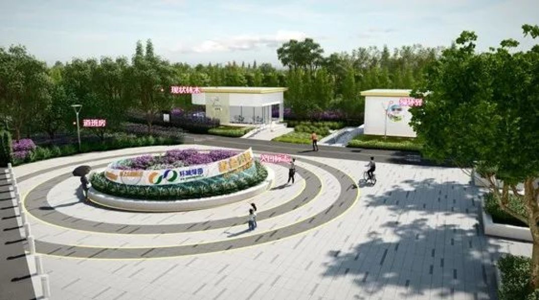 设计强化环城绿带中“环”的形态特征,景观以环形为设计元素进行打造,营造具有标志性的入口景观;通过在环形广场中心位置设置起点公园标志牌,增强公园入口标识性;同时增设服务驿站、公厕、道班房等配套建筑,满足公园日常养护管理及配套服务功能;在凌江路一侧设置停车功能区域,满足非机动车及机动车停车需求。