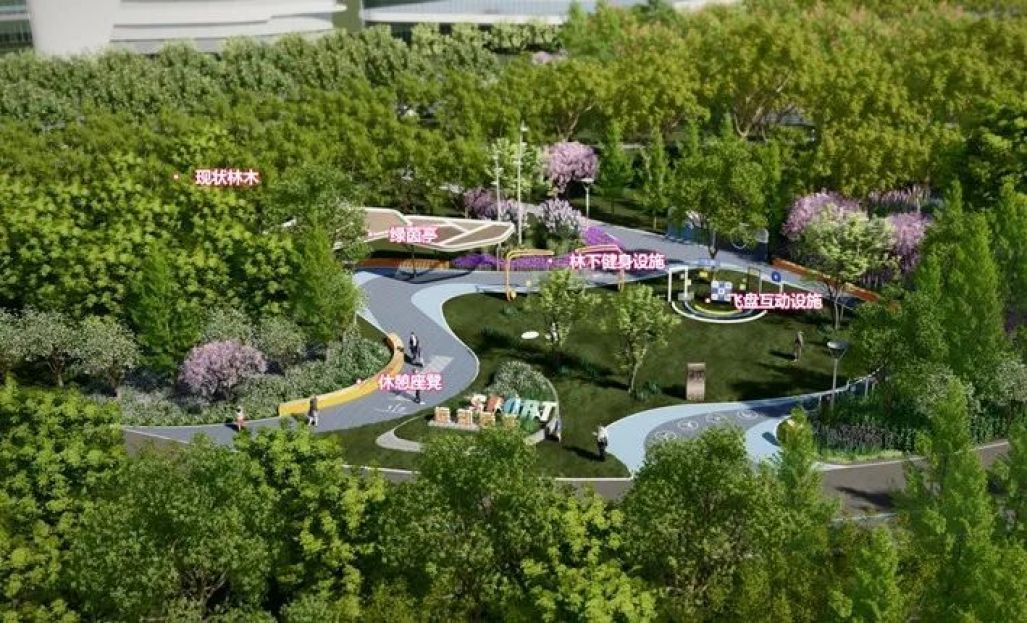 活力运动区位于公园中部,设计在尽可能保留现状树木的前提下,在相对开阔且苗木较少的区域设置活动场地,通过设置户外潮玩设施及亲子互动场地,激发场地活力。本区域主要建设内容包括儿童活动设施、休憩廊架、园路步道。