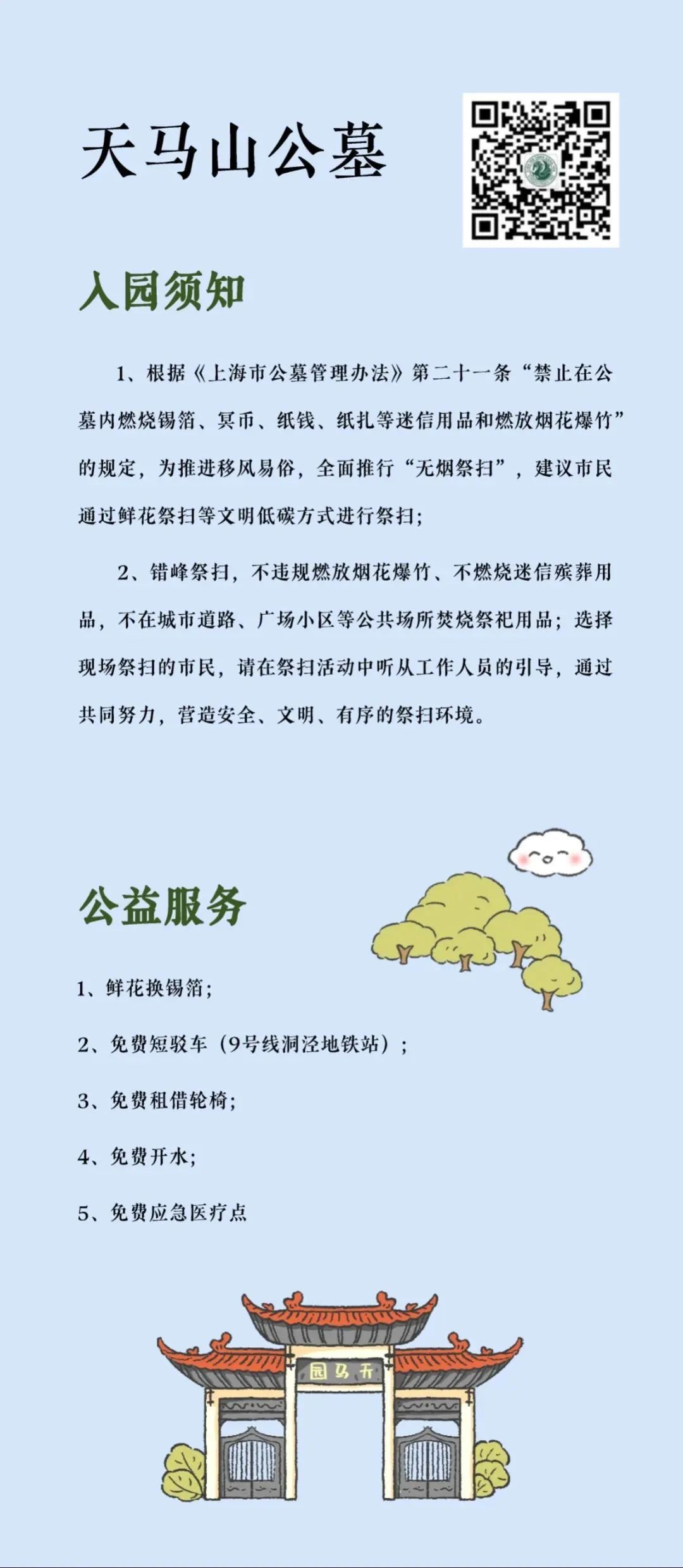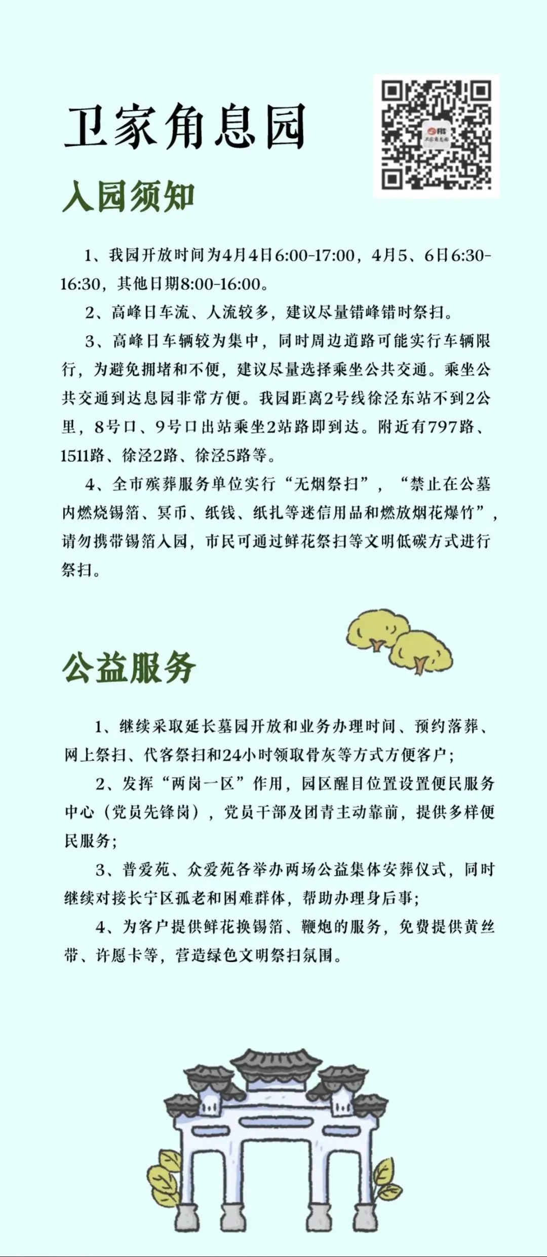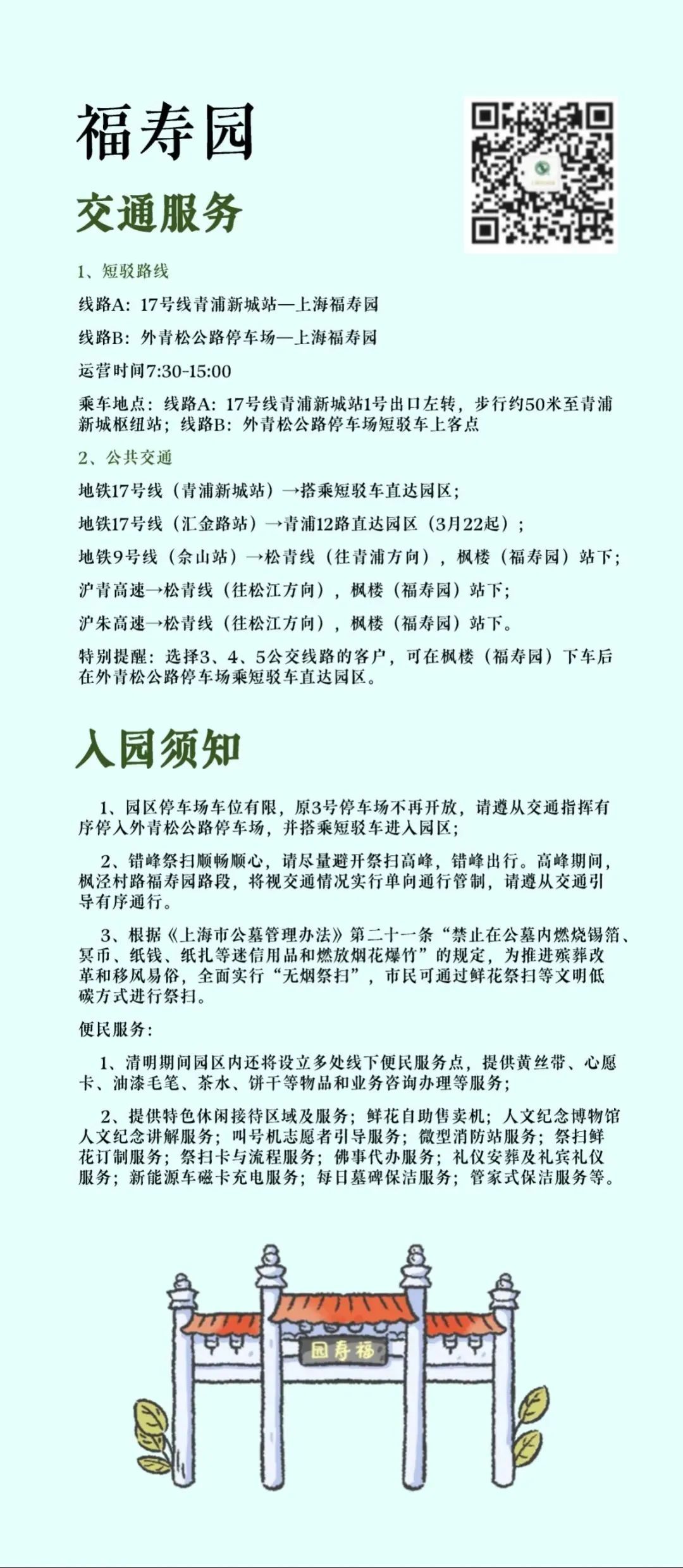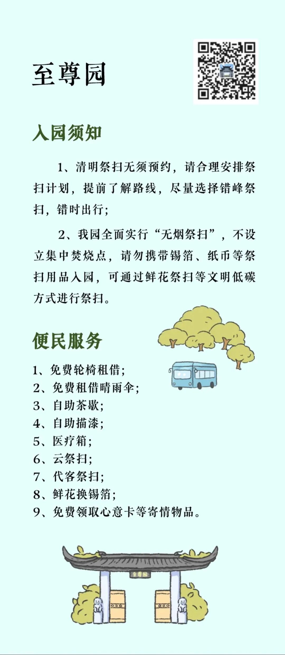 “清明祭扫便民服务指南”将墓园“入园须知、交通服务、便民服务、温馨提示”等信息进行集约化编辑,并按照区域分布,设计成统一图片格式的资讯包,方便市民了解和转发,也为墓园服务信息的集中展现提供了平台支持。