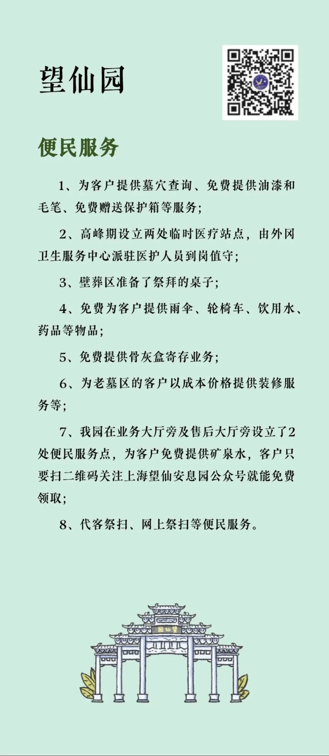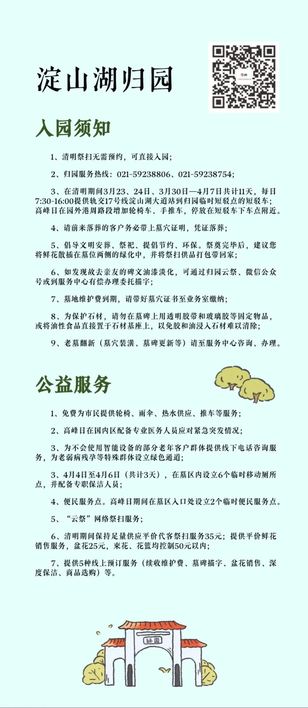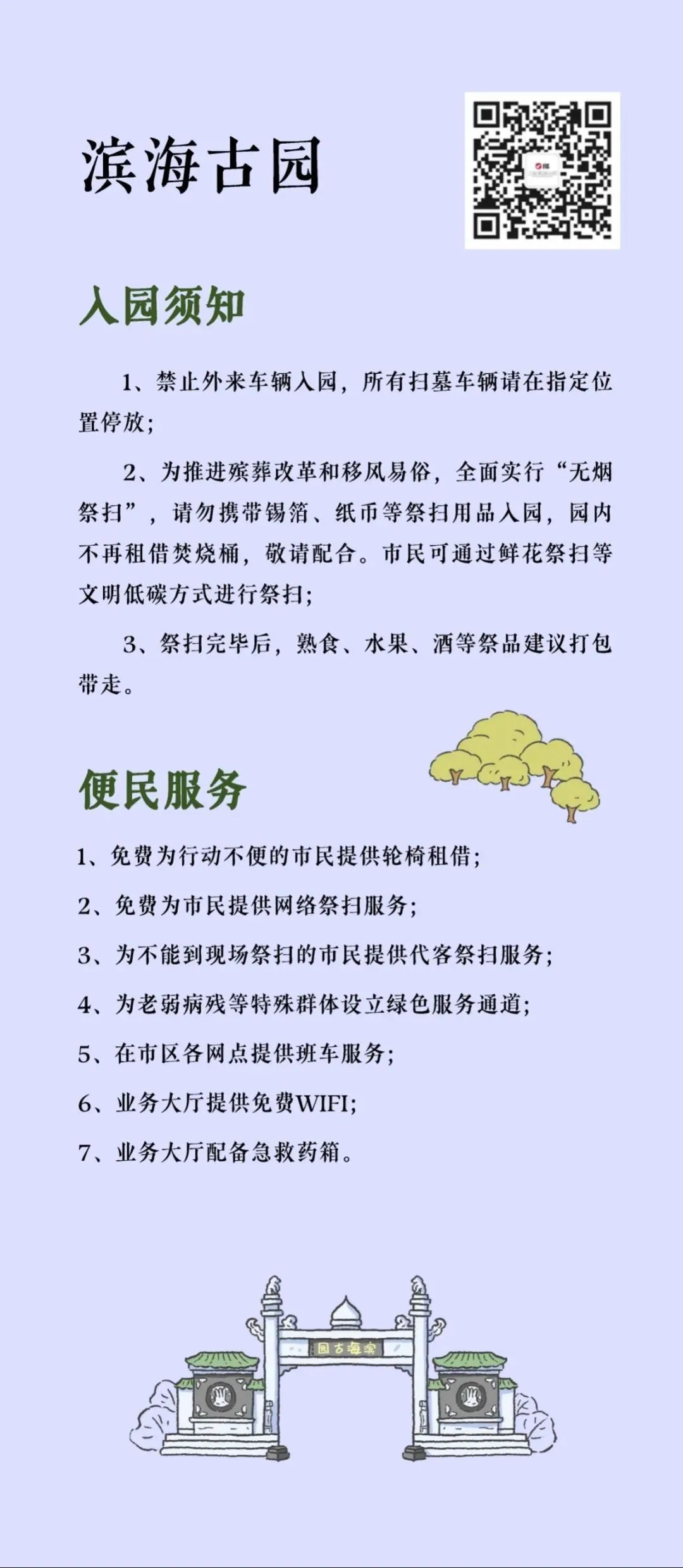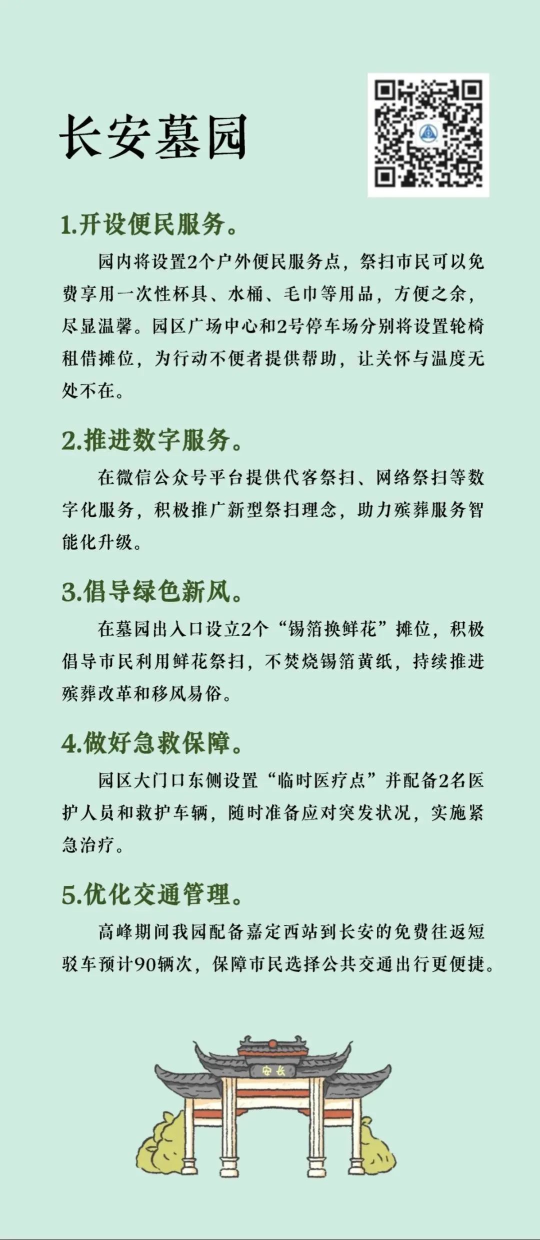 “清明祭扫便民服务指南”将墓园“入园须知、交通服务、便民服务、温馨提示”等信息进行集约化编辑,并按照区域分布,设计成统一图片格式的资讯包,方便市民了解和转发,也为墓园服务信息的集中展现提供了平台支持。