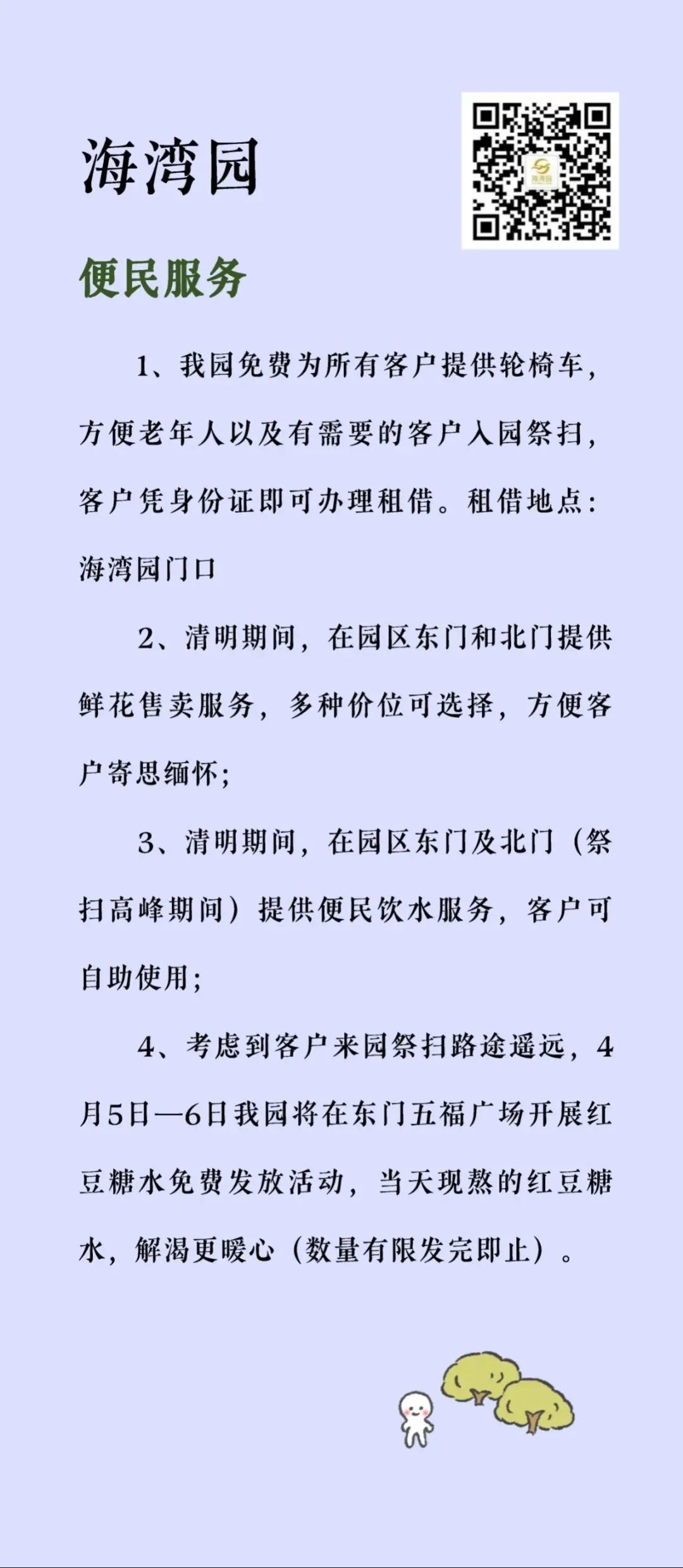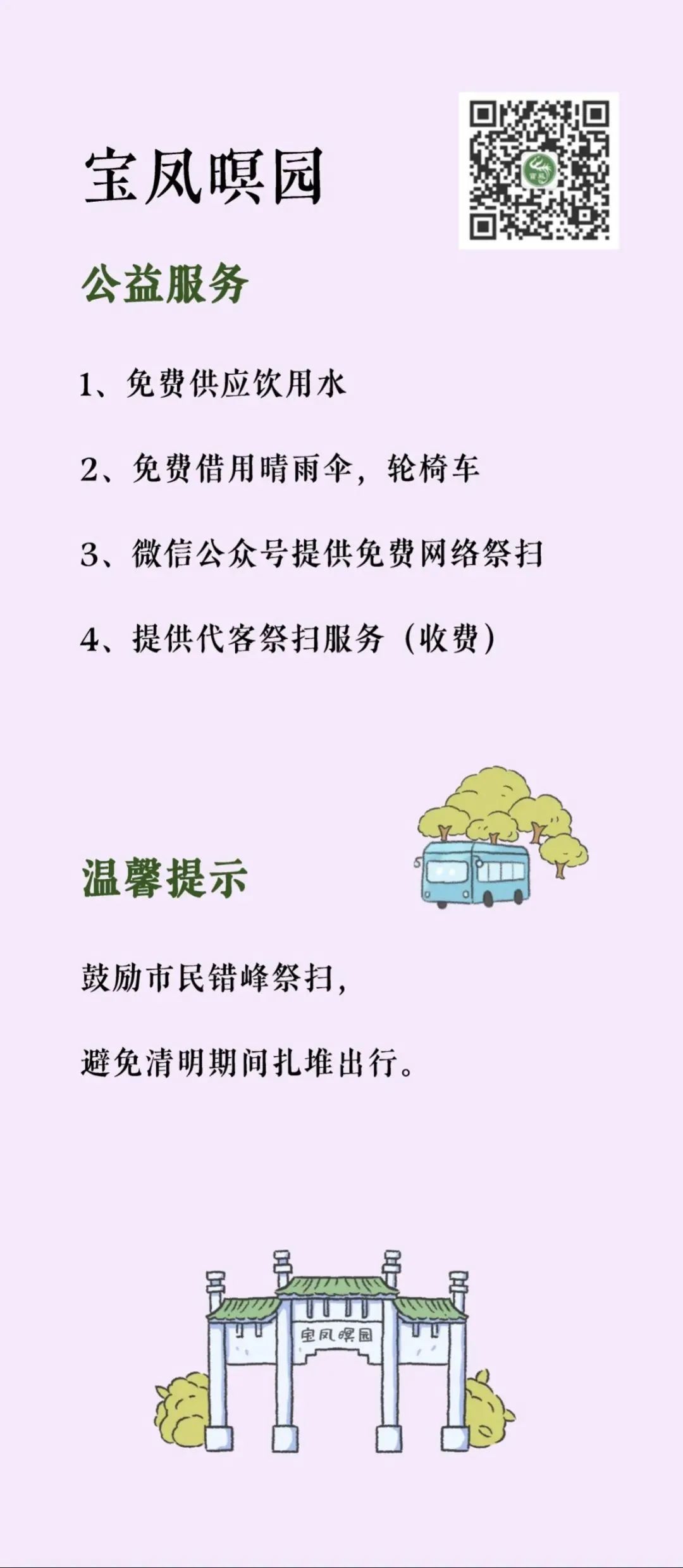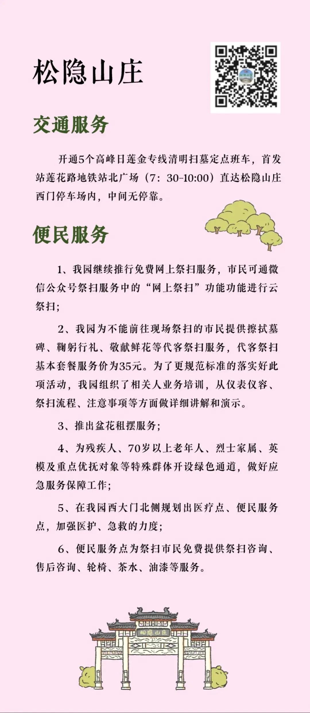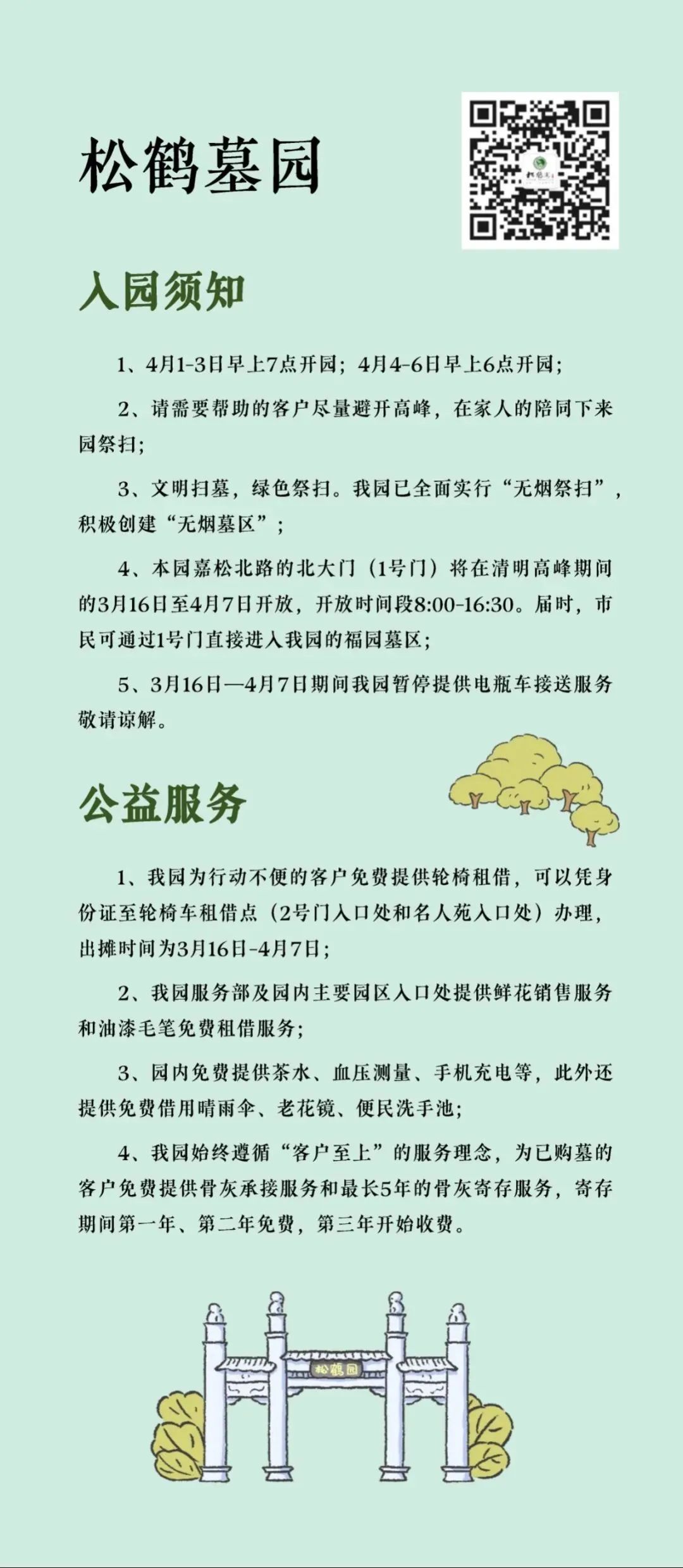 “清明祭扫便民服务指南”将墓园“入园须知、交通服务、便民服务、温馨提示”等信息进行集约化编辑,并按照区域分布,设计成统一图片格式的资讯包,方便市民了解和转发,也为墓园服务信息的集中展现提供了平台支持。