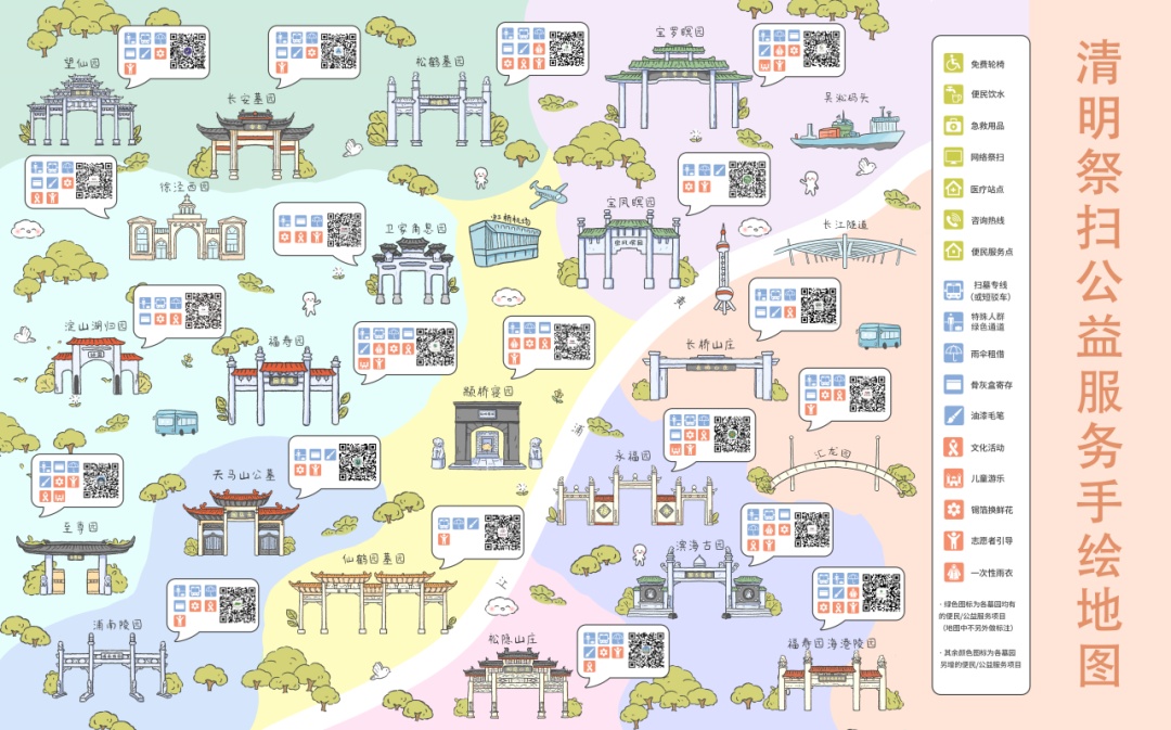 “清明祭扫公益服务手绘地图”整合涵盖墓园“地理位置、微信公众号、公益设施、绿色通道、扫墓专线、免费服务”等多项内容的服务图标,极大提高市民对于墓园公益服务的辨识度。同时,市殡协还联合墓园单位在地图上呈现清明文化系列活动,进一步丰富文化活动载体,渲染良好文化氛围,提升市民祭扫体验。