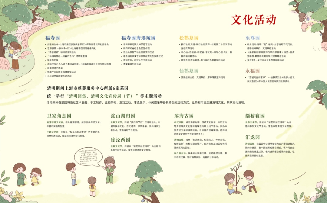 为统筹满足市民祭扫所需,上海市殡葬行业协会(以下简称“市殡协”)首次尝试搜集和整理本市23家祭扫量较大墓园的服务信息,设计推出“清明祭扫公益服务手绘地图”和“清明祭扫便民服务指南”,以生动有趣的风格将墓园的祭扫信息集中体现,在方便市民的同时传递温暖。