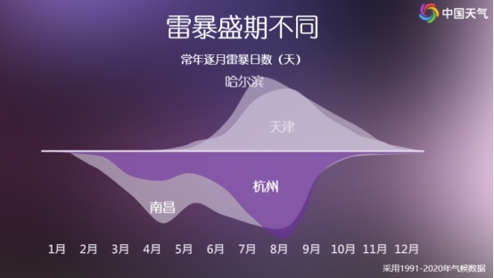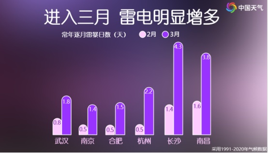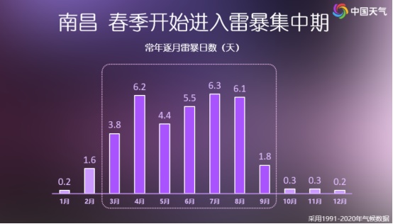 比如南昌,雷暴天气从三月开始明显增多,到了四月,平均雷暴日数为 6.2 天,仅次于 7 月。