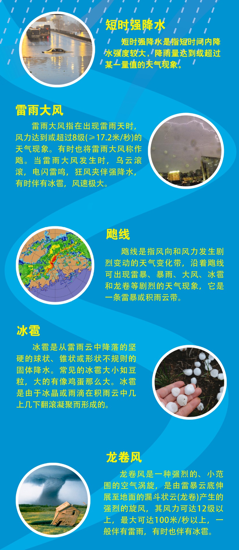 强对流天气是指发生突然、移动迅速、天气剧烈、破坏力强的灾害性天气,常见的有雷雨大风、冰雹、短时强降雨;还有一些不那么常见的,如龙卷风、下击暴流等。