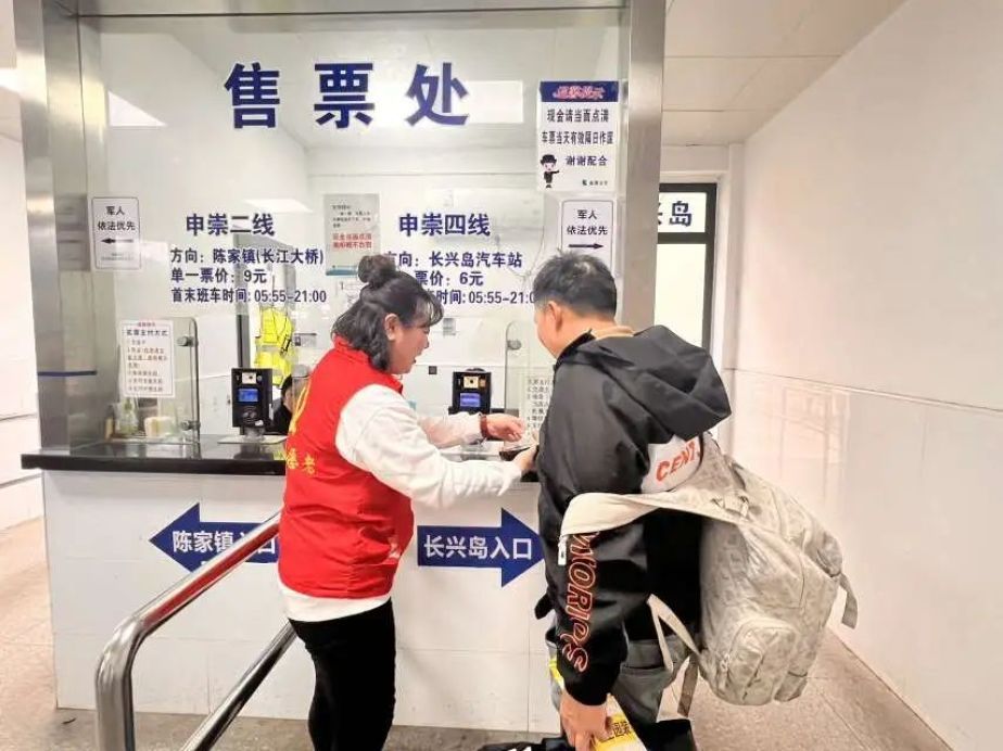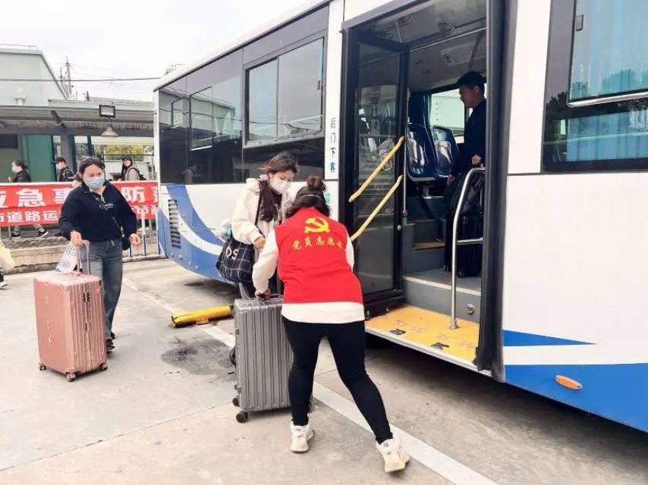 同时,当天在金高公交二分公司党支部的带领下,党员、团员、青年沙龙志愿者们身穿“党员志愿者”“浦东公交志愿者”马甲为前往崇明祭扫、踏青的乘客提供服务。在五洲大道枢纽站引导乘客排队、购票、上下车等流程,帮助带有行李的乘客摆放行李箱,指挥公交车辆安全进出站,现场秩序井然。