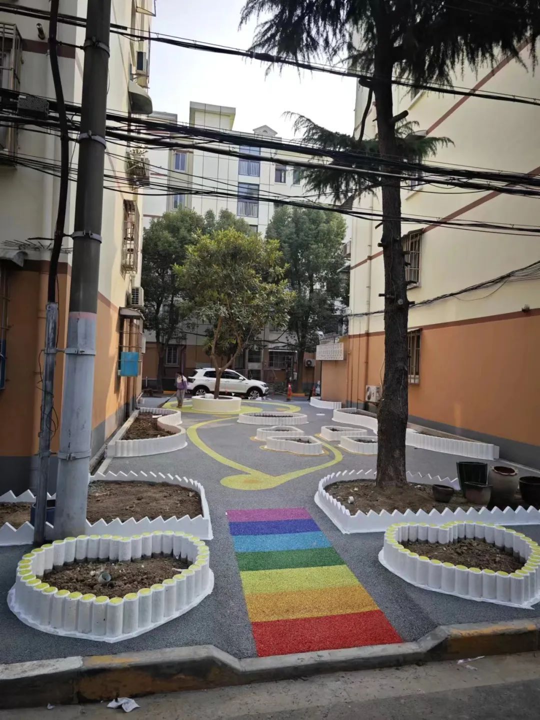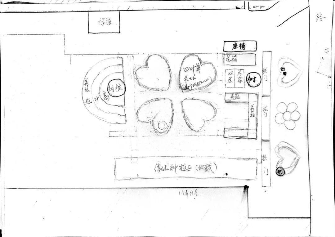 古一“四叶园”前身为两楼间的荒废绿地,花园的设计者是周边楼栋的一位家长。出于“想给孩子们一片安全的活动空间”的愿望,他将“社区花园”与“儿童友好”相结合,手绘出了理想中的社区花园,并参与了虹梅社区基金会的公益创投,后经基金会实地考察予以资金支持。从图纸到实物,居民的花园设计一分未动走进了现实。