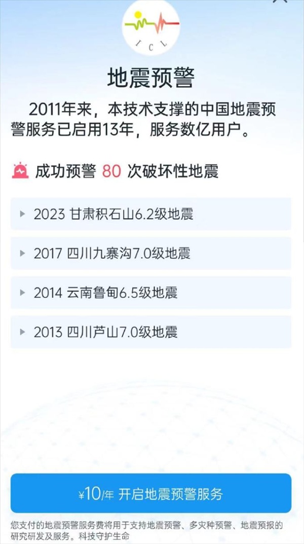 根据网友的曝料,该APP收费界面信息显示,加入会员可享受优先预警和倒计时报警,“支付的会员费将用于支持地震预警、多灾种预警、地震预报的研究、研发、服务。”