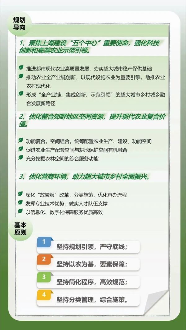 《实施意见》以“上海2035”城市总体规划为统领,以有效解决涉农企业和基层政府急难愁盼为目标,切实加强农业生产点状配套设施的规划引领、资源保障、流程优化、技术服务和政策创新,着力构建全周期贯通的规划资源服务保障体系,进一步提升农业生产配套项目落地实施的综合保障能力,深化巩固都市现代农业发展基础。