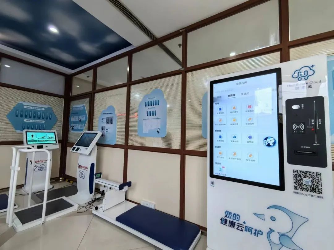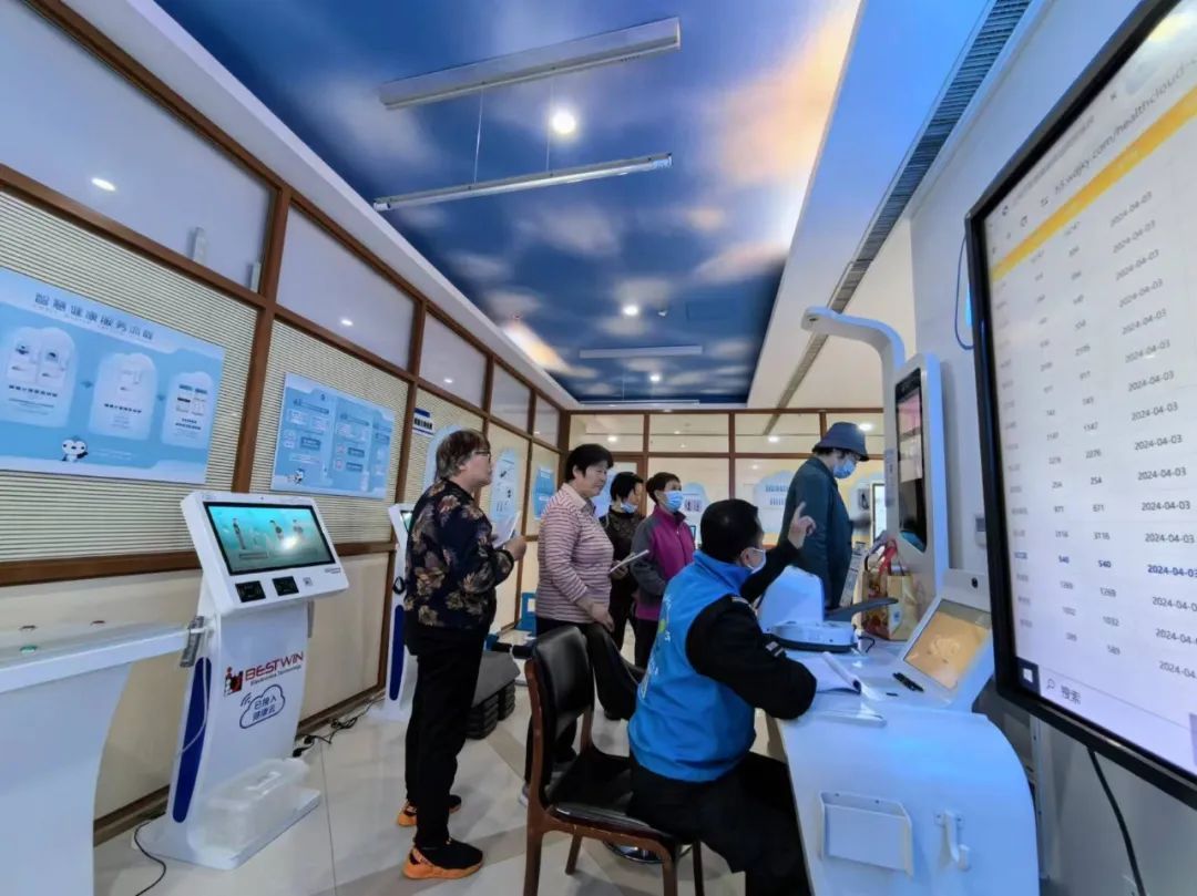 健康驿站位于一楼门诊大厅,约57平方米的空间内,摆放着可以测量血压、身高体重、心电的一体化健康自助检测设备和体质自测设备。4月3日一早,记者在该健康驿站看到,志愿者文太金忙着帮居民登记、指导操作。居民朱红芳因为血压偏高,是智慧健康驿站的常客。“周一到周日都开放的,从家里过来也方便,刷一下医保卡就能测,真是家门口的健康管家。”朱红芳说。