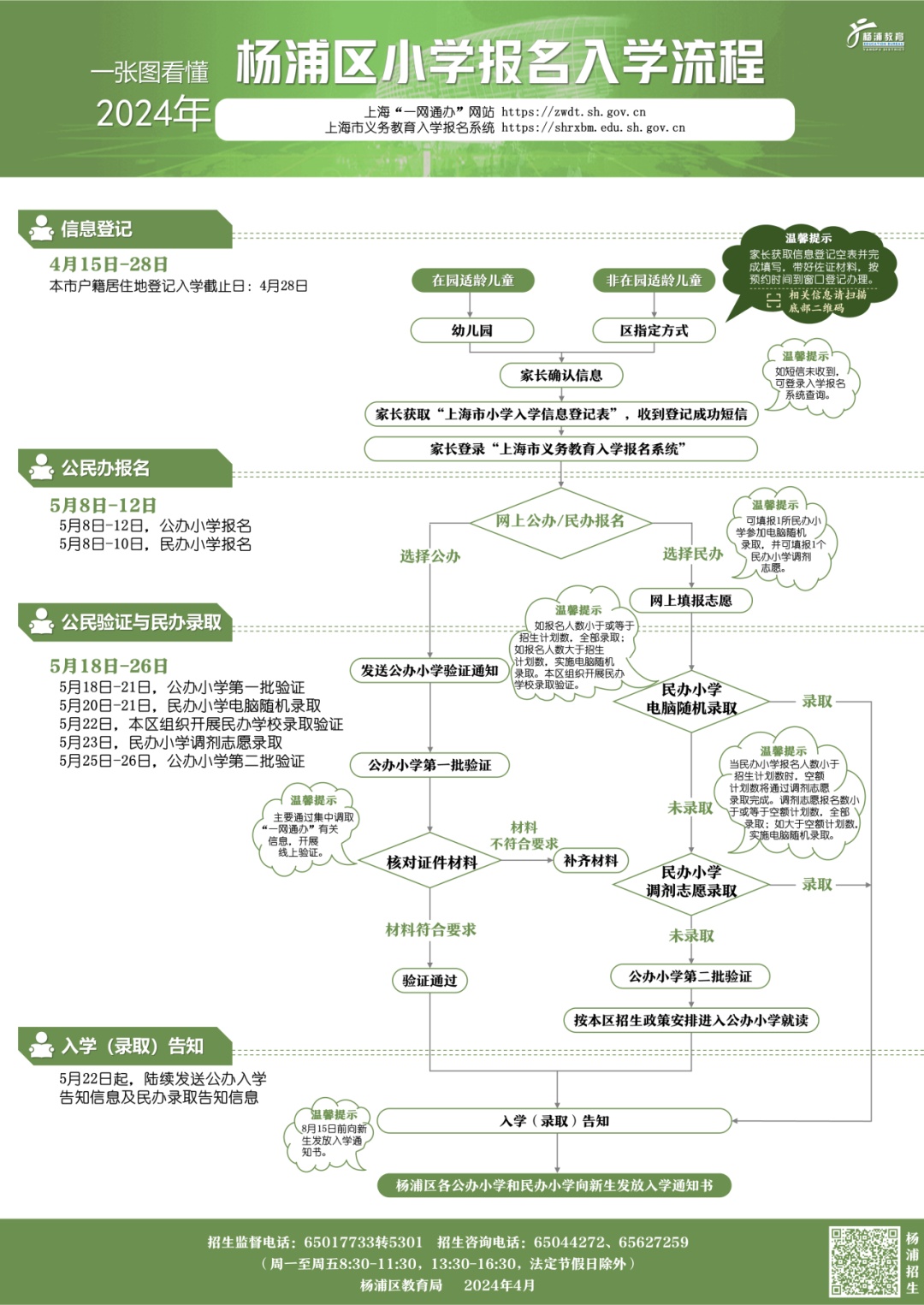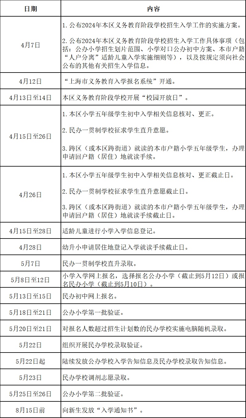 4.发放入学告知。5月22日起,将通过短信、“上海市义务教育入学报名系统”等渠道陆续告知相关入学信息。民办学校完成招生工作后,将录取名单上报区教育局。学生按学校通知办理入学手续。
