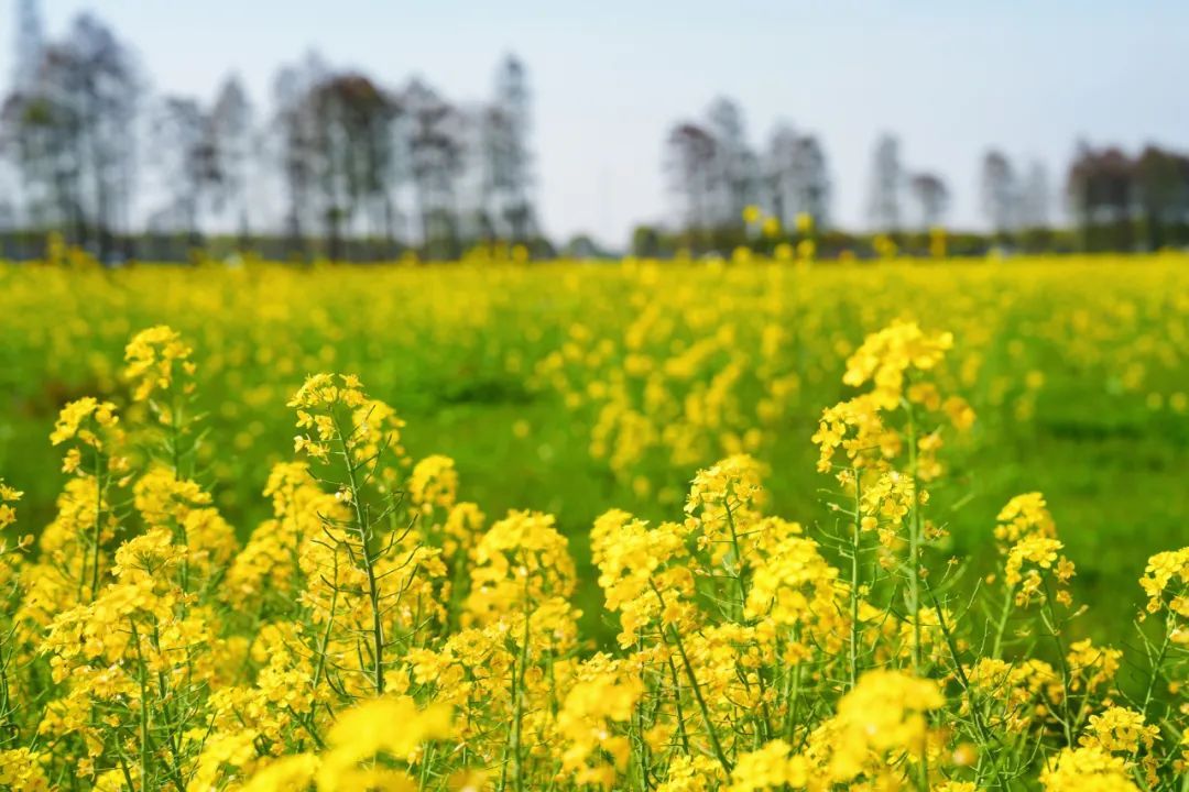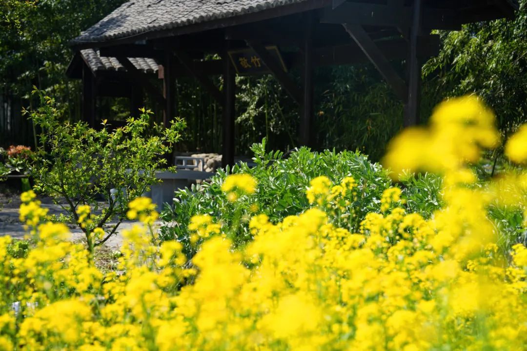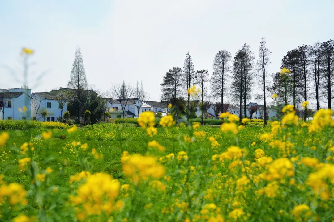 不远处的阡陌田间,亦是楚楚动人。灿若金黄的油菜花田一眼望不到边际,极为壮观,是江南典型的时令美景。春风拂过,淡淡的花香扑鼻而来,也吸引着蜜蜂和蝴蝶纷纷前来采蜜。不知不觉,使人陶醉在这片如诗如画般的春日景象中,渐渐忘却了烦恼,与美景融为一体。