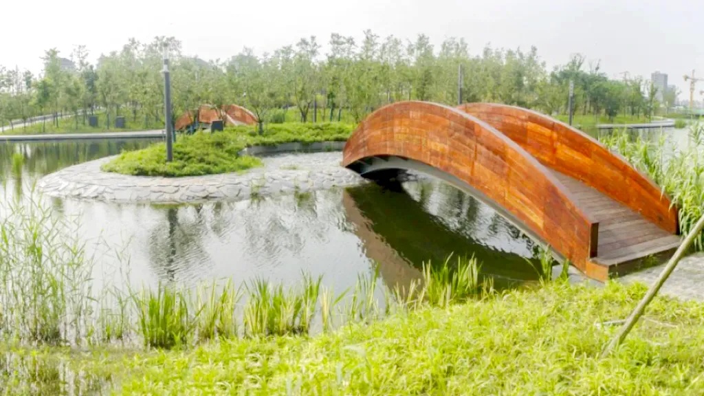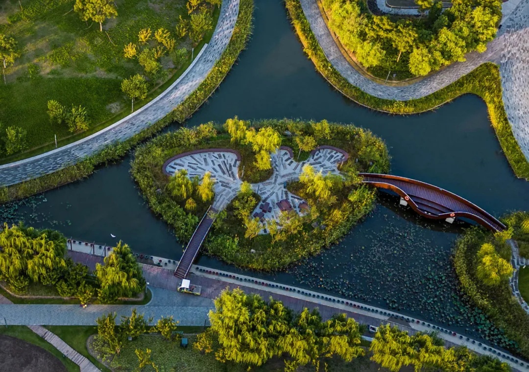 公园的形态设计以中国传统书法和舞蹈为灵感,以“Moving Cloud Running Water·行云流水”为概念。在人行视角中,这种形态体现为交错的通行空间与交织的自然空间。而在鸟瞰的视角下,这种流畅的构成感成为公园最主要的视觉特征。