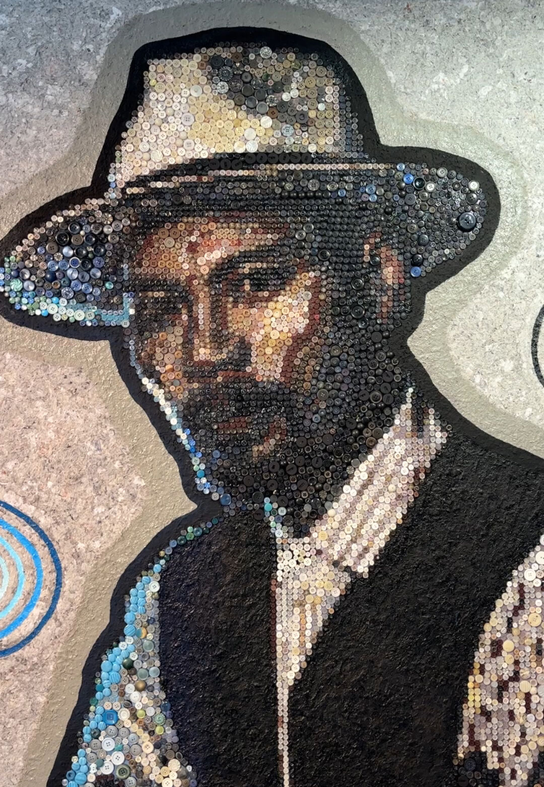走进九点水美术馆·树屋馆,映入眼帘的是吴阳德特意为此次展览创作的自画像。这并非传统的绘画作品,而是由各类纽扣巧妙地排列组合而构成。废旧的齿轮、锈迹斑驳的螺丝,以及自然磨损的木板、陶瓷、布料,在他手中重获新生,展现出超越常规审美的魅力。