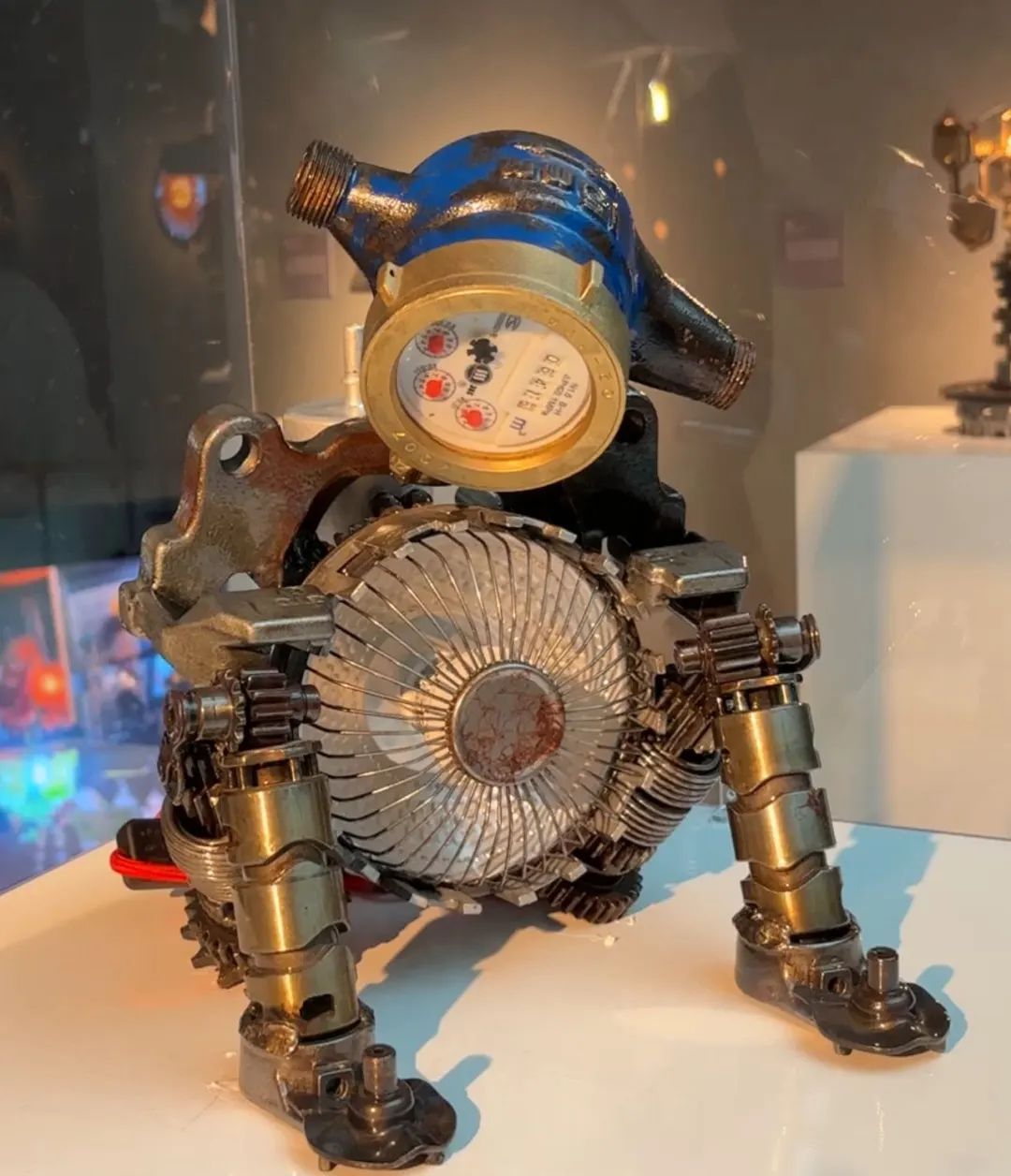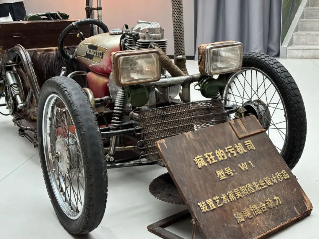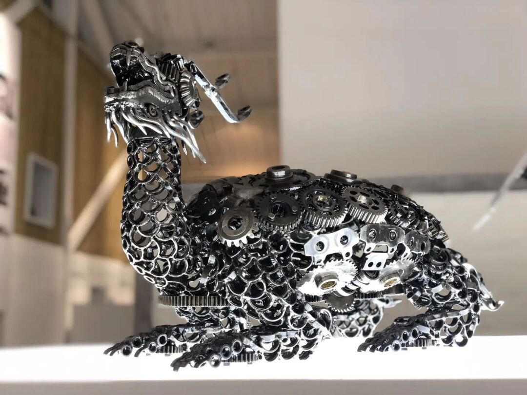 由废旧化油器分解重组后改造成的八音盒,造型如卡通版骑士,表情夸张呆萌;废旧轮胎、刹车碟、链条、齿轮等零件,经过处理后,变成了“上古武士”“燃灯神兽”“蓝朋友”;两辆报废的“90后”摩托车加上几十件废旧物品,重新组装成一辆能动能跑的敞篷老爷车……