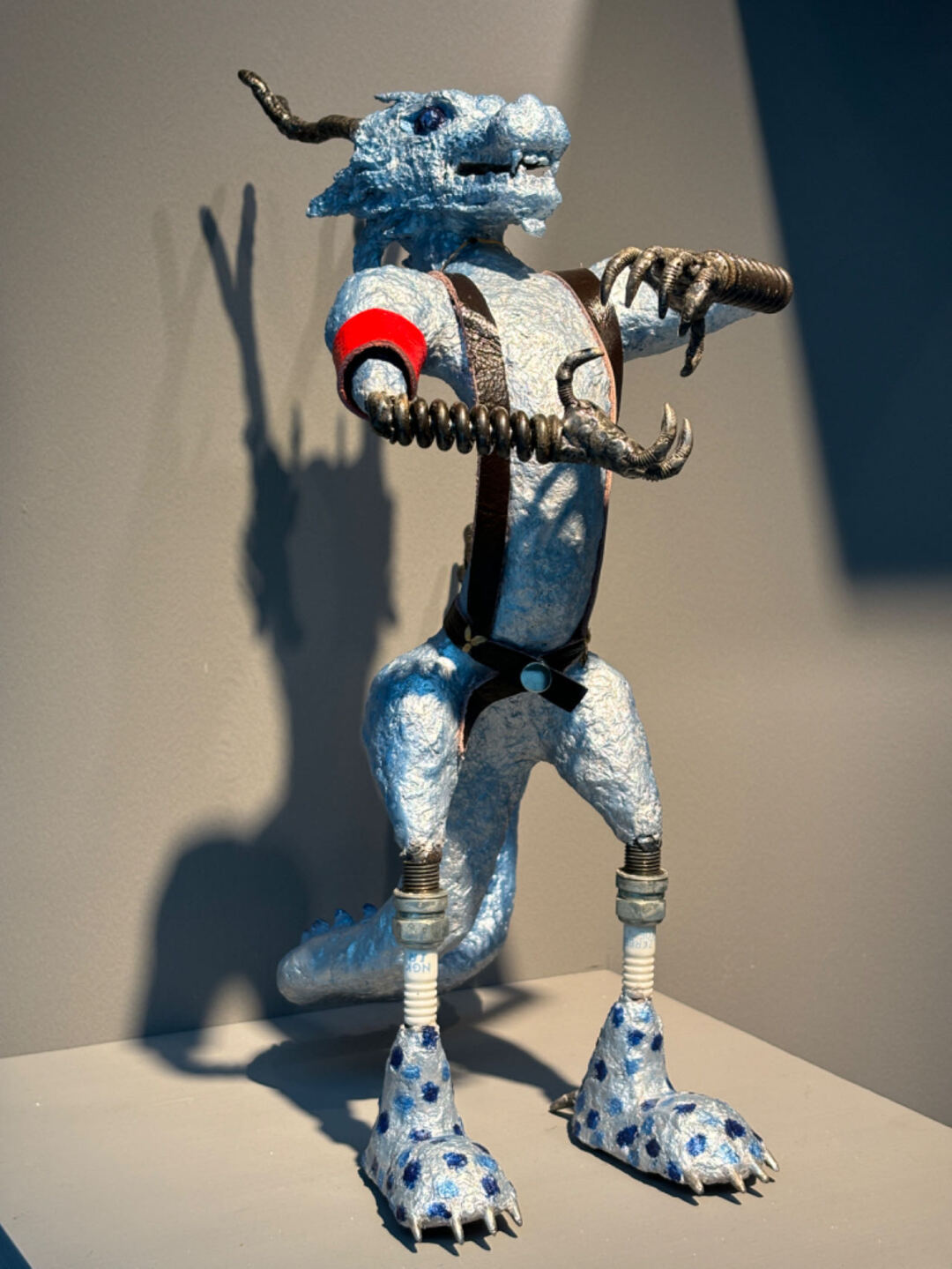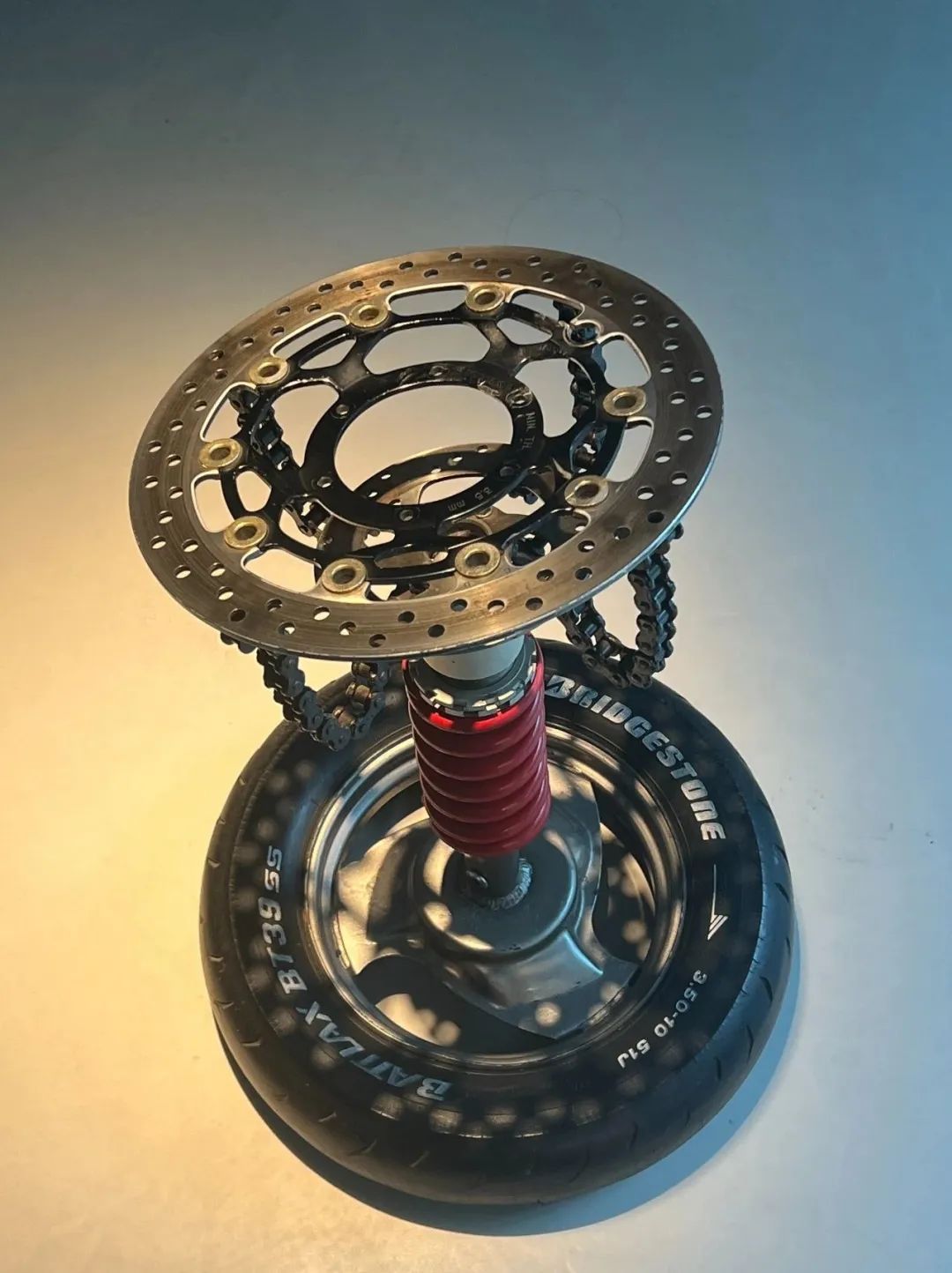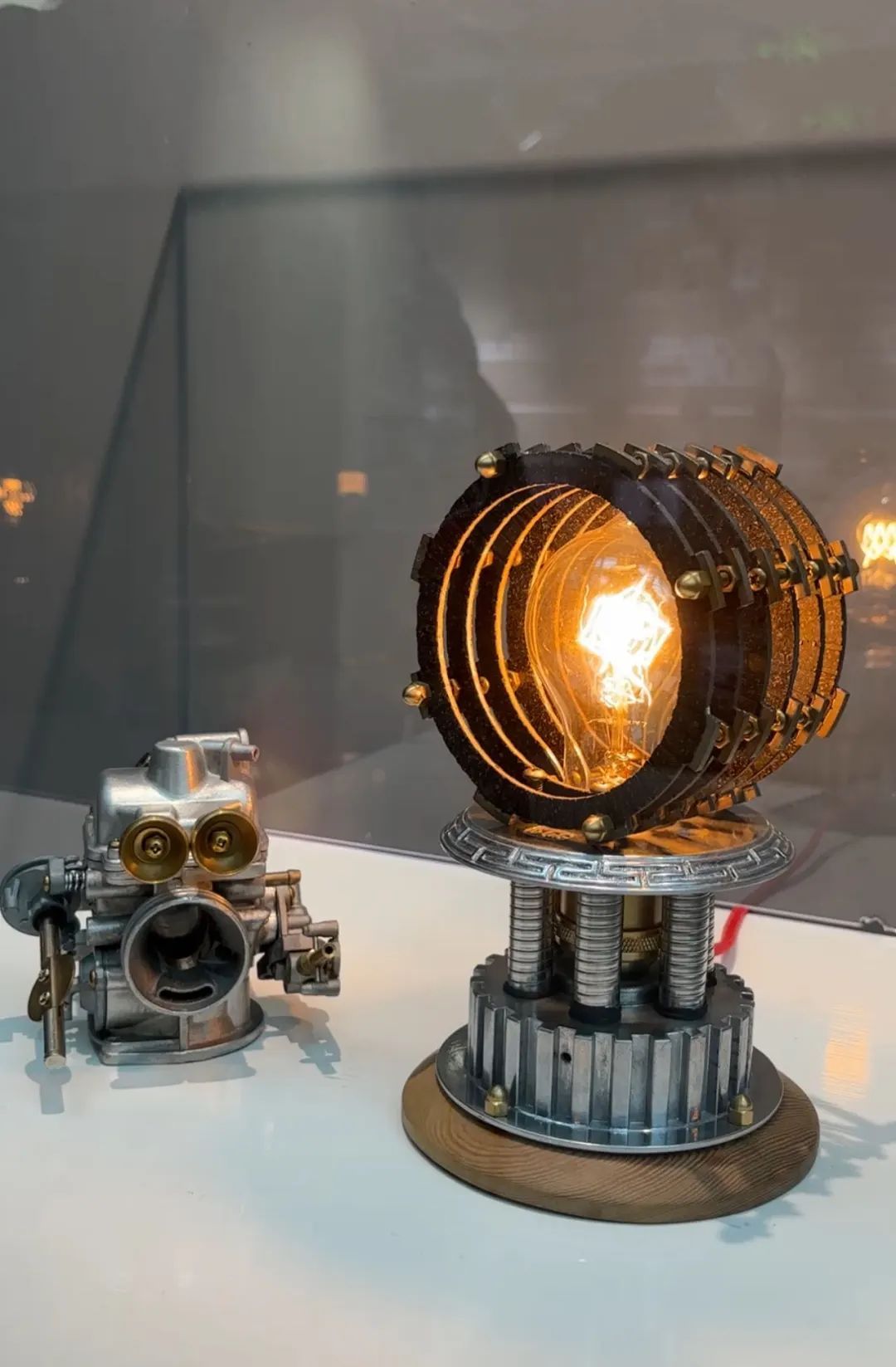 由废旧化油器分解重组后改造成的八音盒,造型如卡通版骑士,表情夸张呆萌;废旧轮胎、刹车碟、链条、齿轮等零件,经过处理后,变成了“上古武士”“燃灯神兽”“蓝朋友”;两辆报废的“90后”摩托车加上几十件废旧物品,重新组装成一辆能动能跑的敞篷老爷车……