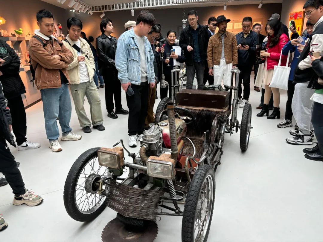 置身于吴阳德的奇幻世界,观展者们无不沉浸在他天马行空的创造力之中。大家聚集在各装置作品前,低声交谈,分享各自对作品的理解和感受:“太酷了!”“污机司的创作让我看到了零件的另一种可能。摩托车上的零件可以变成一盏灯、一只动物,化身为具有情感温度的生命体。”另一名观展者表示,他特别喜欢那辆敞篷老爷车,“以为是静态的模型,没想到竟然是油电混合动力,竟然能开动!”