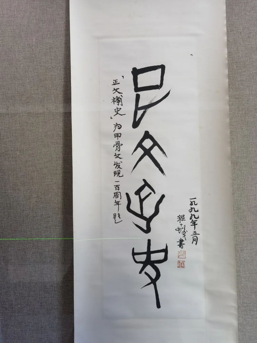众所周知,程十发在书法结字习惯和异体字的书写中极具个性,展览中的一幅93×33厘米的甲骨文作品“正文补史”亦画亦书,妙趣横生。
