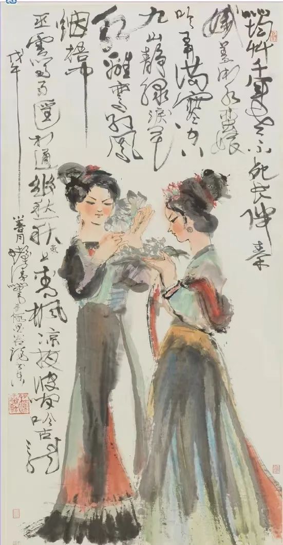 “书即是画,画即是书”。在程十发的眼中书画应该是完美合一的,因此在所展出的不多的几幅画作中可以看到,他会把题跋写成小小的两三行局促在不走眼的角落里,也会将人物画屈就在长题跋的画幅中四周大片留白,还会在本就丰富的画下面盖一个大大的章使得作品结构更具有艺术性。