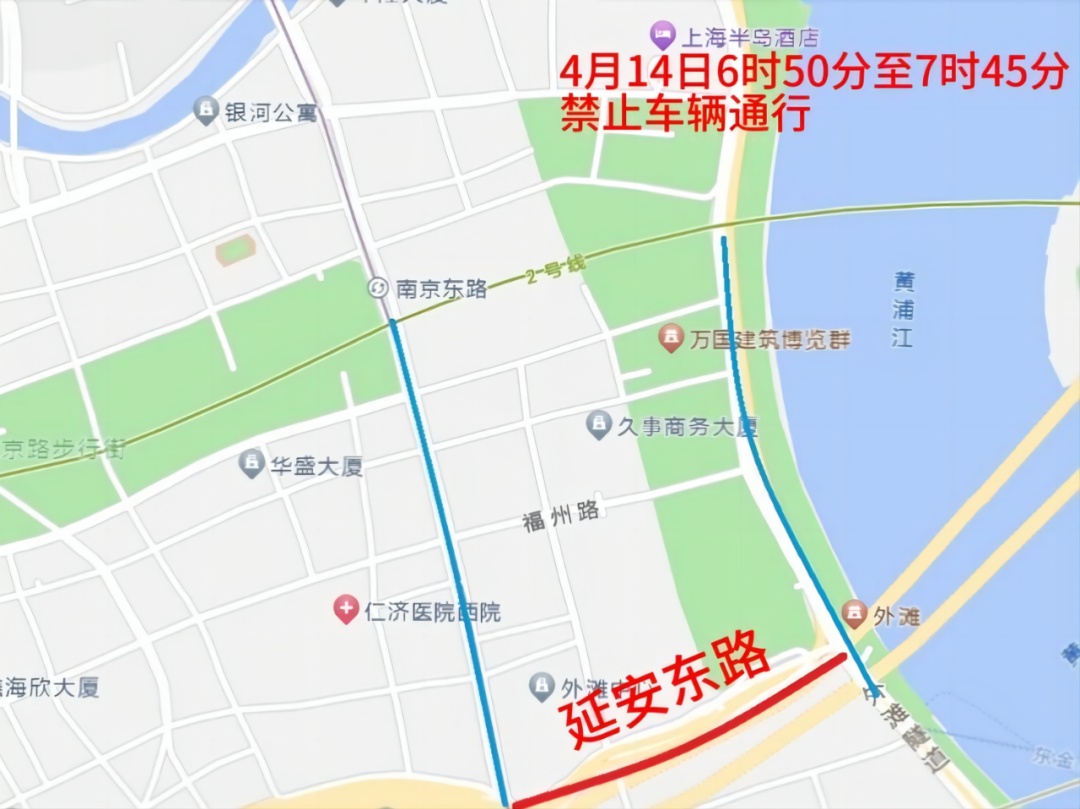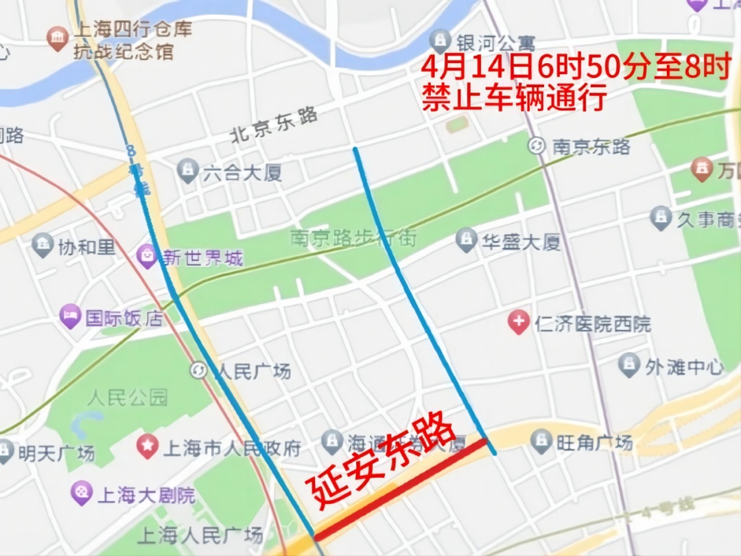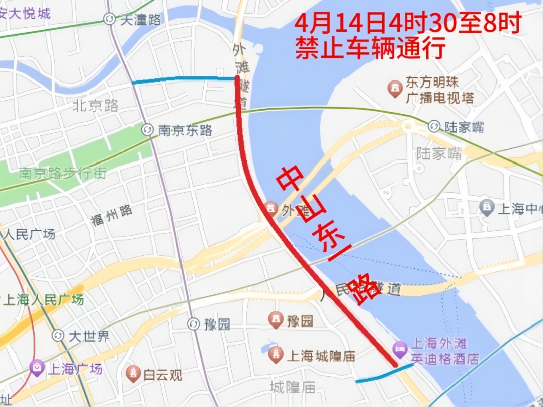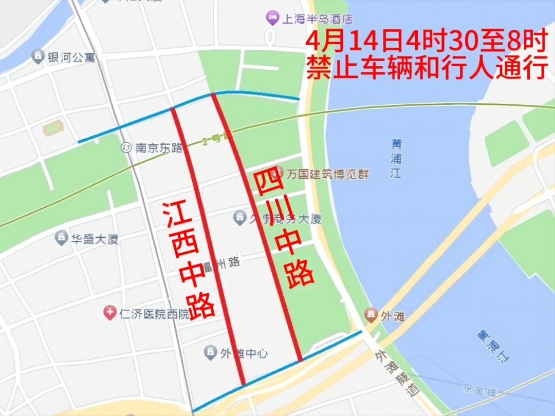 二、4月14日4时30分至8时,江西中路(延安东路—天津路)、四川中路(延安东路—滇池路)禁止车辆和行人通行。中山东一路(北京东路—东门路)禁止车辆通行。