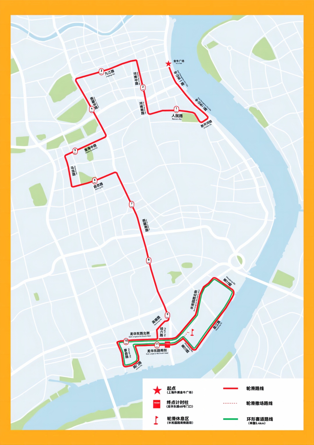 七、4月14日7时至9时,马拉松赛途经的中山东一路—中山东二路—新开河路—人民路—河南南(中)路—九江路—西藏中(南)路(逆向)—淮海中路—马当路—自忠路—西藏南路—高雄路—经六路-龙华东路—蒙自路—局门路—龙华东路—苗江路—半淞园路—龙华东路—世博展览馆(终点),在运动员临近时实施交通管制措施,其中: