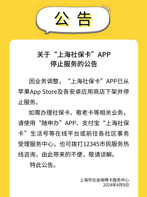 公告称,因业务调整,“上海社保卡”APP已从苹果App Store及各安卓应用商店下架并停止服务。
