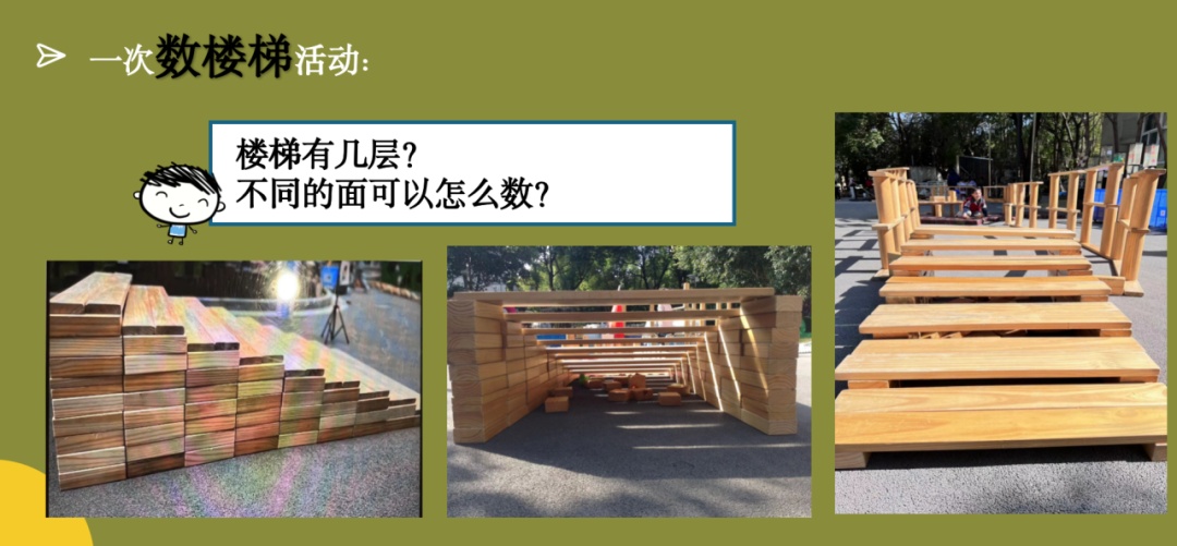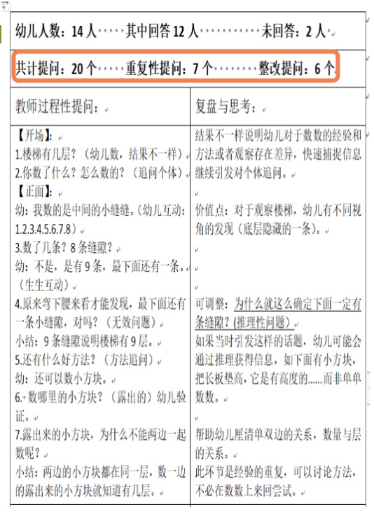 在一次“数楼梯”的活动中,老师们在回看中发现在这过程中自己向孩子提问了20多次,重复性提问7次。他们在研讨中发现普遍存在不该问的时候着急问、该追问的时候没有问等现象。