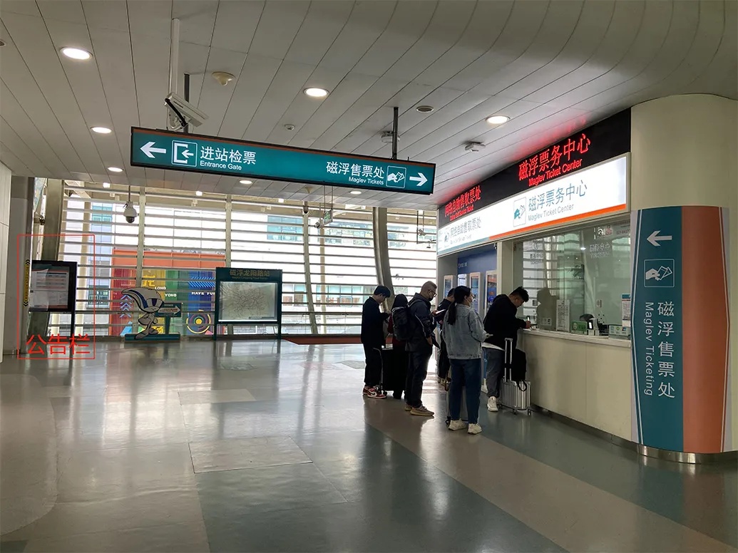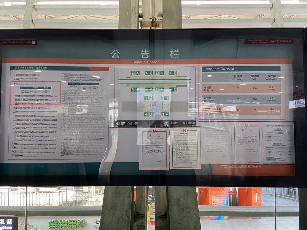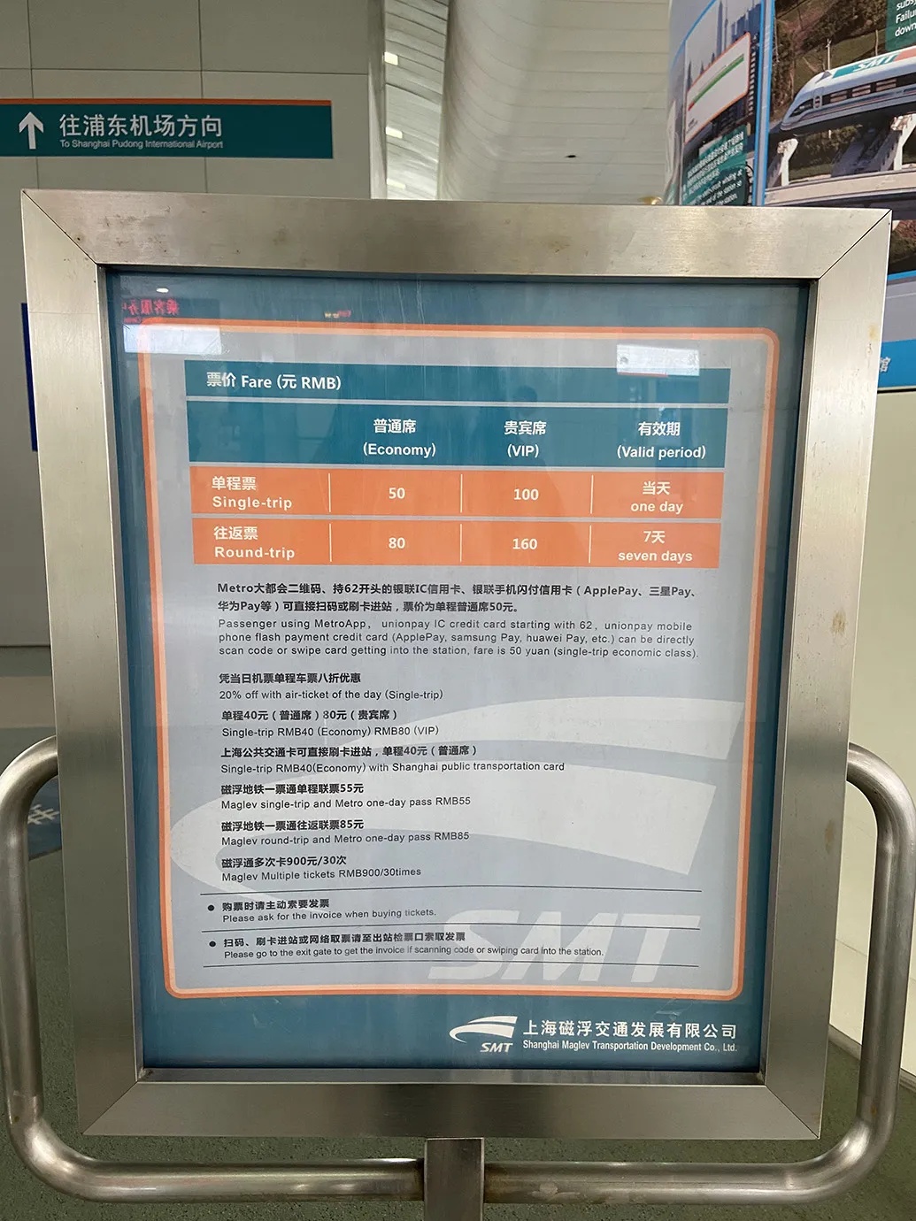 靠近电梯的公告栏张贴了《乘客须知》、票价信息、磁浮列车运行信息等众多内容,检票口旁边也有一张票价告示牌。《乘客须知》和票价告示牌的表格显示,单程票(当日有效)普通席50元,往返票(7日内有效)普通席80元。表格下方有小字注明:乘客可凭本人当日飞机票以八折的价格购买磁浮单程票,每张飞机票限购一张单程票;上海公共交通卡可直接刷卡进站,单程40元(普通席)。公告栏的票价信息表格则多出一行:凭当日机票(单程票)普通席40元,信息更为醒目。