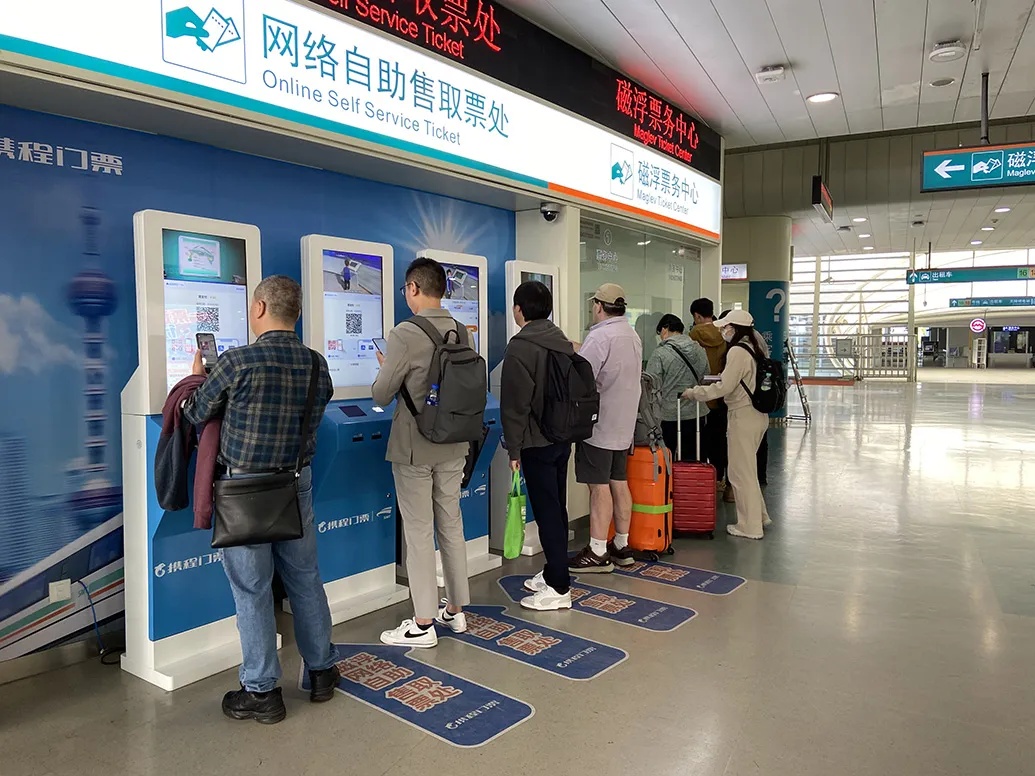 龙阳路站磁浮网络自助售取票处。本文图片均为 澎湃新闻记者 陈悦 图从龙阳路地铁站3号口出来,搭乘电梯上到二层即为磁浮售票处。人工窗口有2名工作人员,自助售取票处设有4台机器,现场没有其他工作人员。