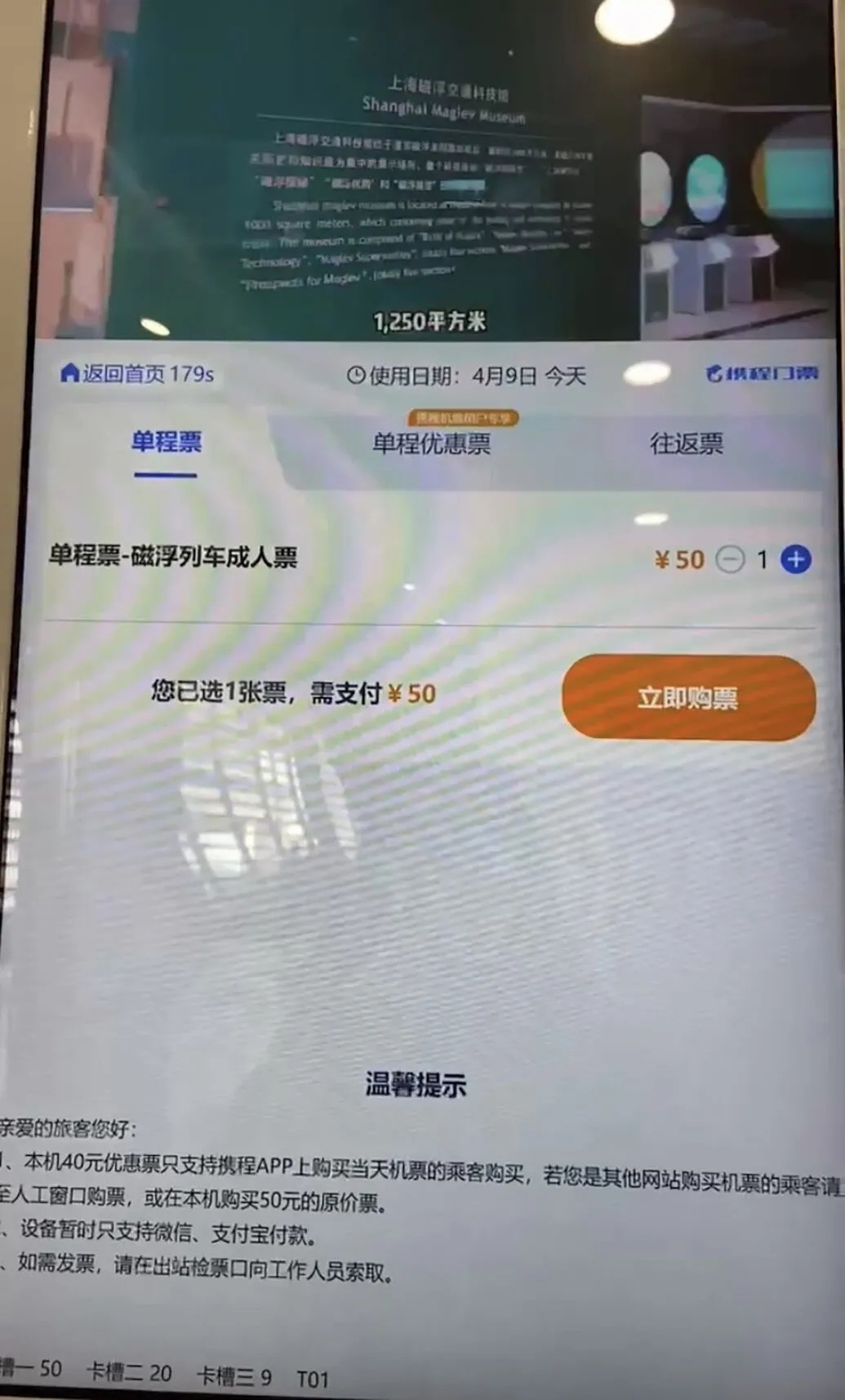 公告栏距离售票处较远,购票者通常不会注意到公告栏信息。记者探访期间,陆陆续续有些购买磁浮车票的乘客,几乎没有排队。大部分人选择了在窗口购票,工作人员会询问:“您好,有机票吗?可以打八折。”只要出示机票订单,即可买到40元的优惠票。也有些人选择在机器上自助买票。机器上有2个选项——购票和互联网取票。屏幕下方有小字温馨提示:本机40元优惠票只支持携程APP上购买当天机票的乘客购买,若您是其他网站购买机票的乘客请至人工窗口购票,或在本机购买50元的原价票。