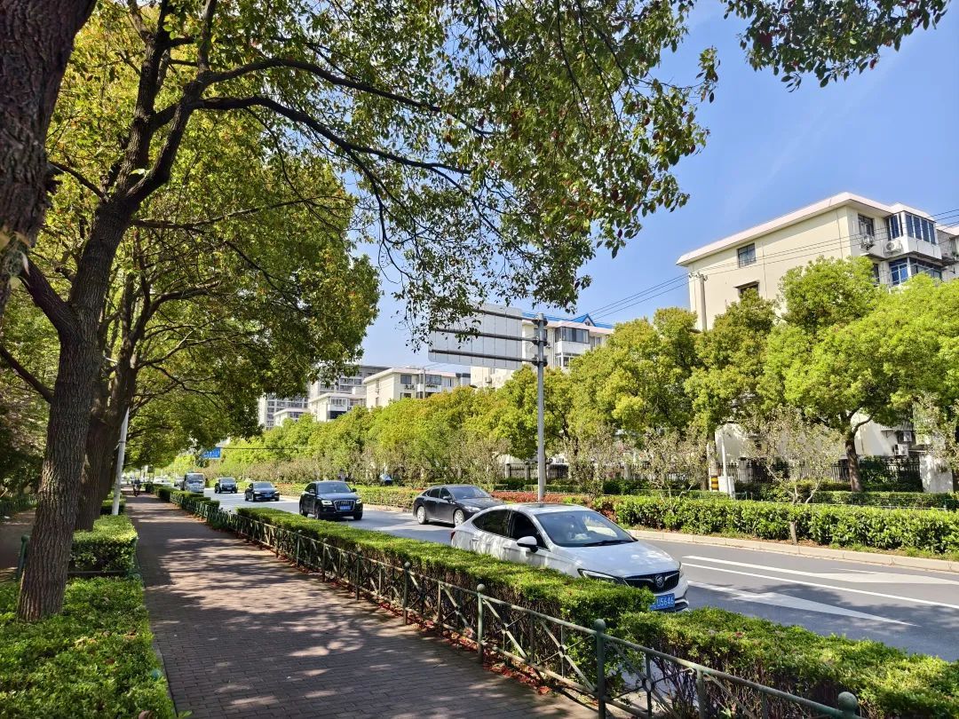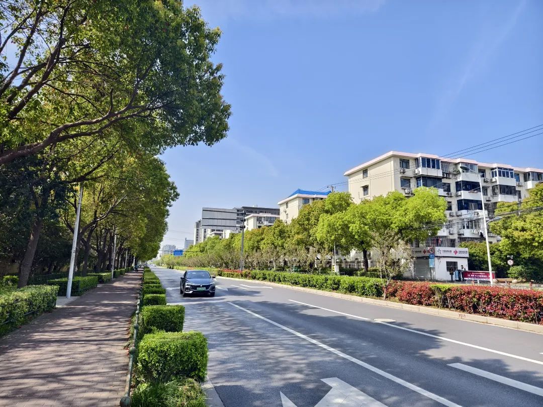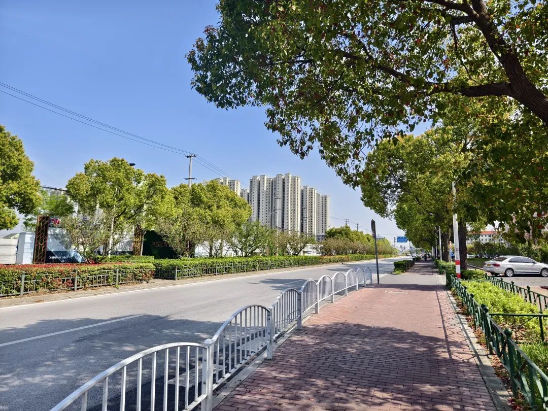 在杨泰路南段,中央隔离带的绿化以垂丝海棠为主,春天的鲜花娇艳妩媚;机非隔离带和人行道两侧的绿化以香樟树为主,部分绿化带还种植了石榴、红花檵木等观赏品种,进一步提升了观赏价值和市民的出行体验;在杨泰路西侧,去年还建成了华师大二附中宝山校区,色彩明快、流线造型的校园建筑进一步提升了杨泰路南段的整体景观,校门附近的港湾式公交车站也相得益彰,使杨泰路沿线的城市功能更完善。