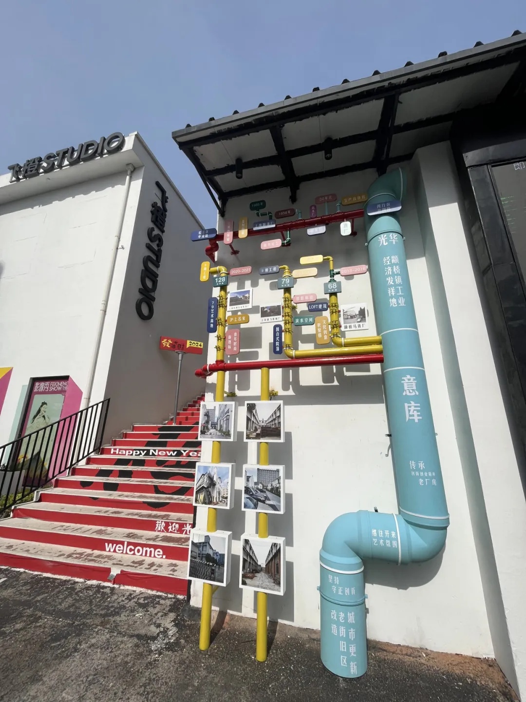 今年,79意库在入口处的大屏旁新增一艺术装置,依然结合园区本身的工业风格,利用水管装置,以关键词名牌的方式展示光华创意街区的大事记,让更多人了解光华路的历史,同时用翻转照片的形式,趣味化地展现79意库的前世与今生。