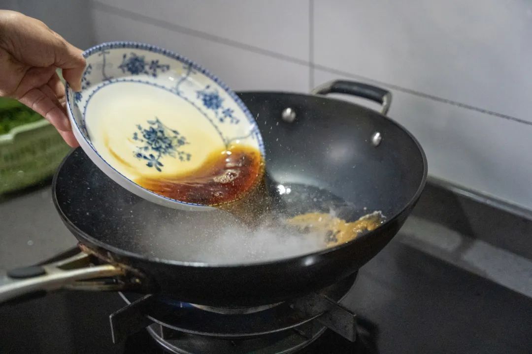 当油温升高,微微冒烟时,倒入我们精心调制的酱汁。随着酱汁与热油的相遇,一股香气瞬间弥漫开来,让人垂涎欲滴。