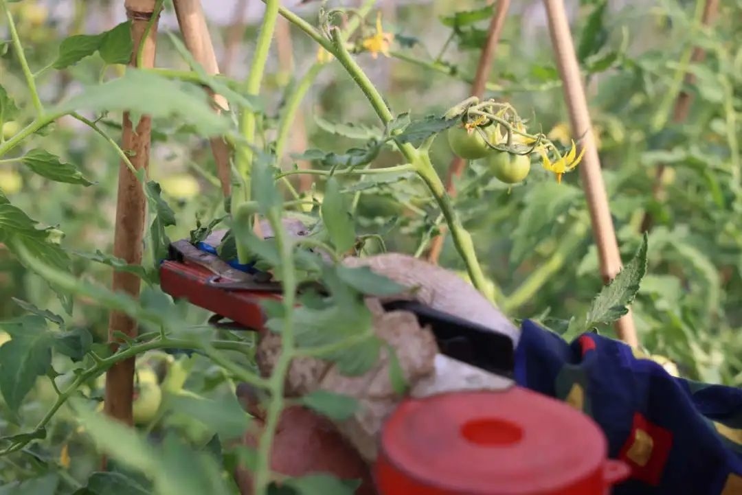在珠丰甜瓜专业合作社的大棚内,几名工人在采摘完成熟的番茄后,又忙着给即将成熟的番茄整枝、绑蔓。工人们告诉记者,这样的栽培方法可以避免果实在成熟后互相积压、影响发育,让果实在成熟后集中成串,外形更显饱满。约两周后,这一批次的“桃太郎”番茄也将集中采摘上市,与市民见面。