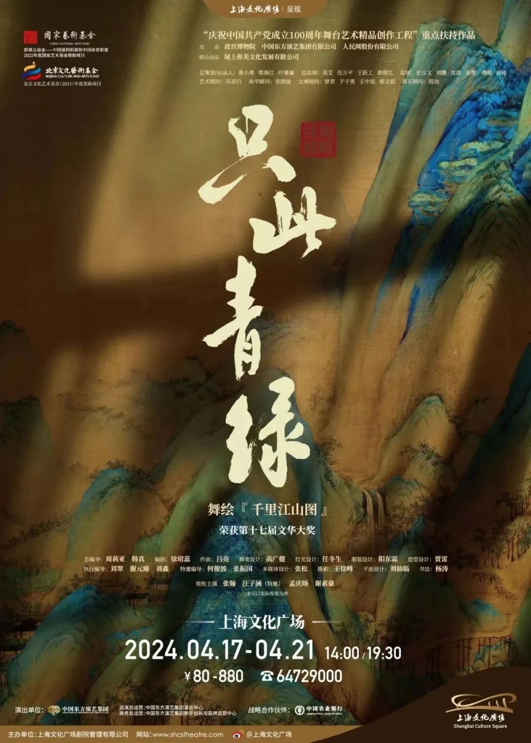 时间:4月17-21日地点:上海文化广场《千里江山图》化身舞蹈诗剧《只此青绿》,用舞台重现大宋美学,连线千年静与动,为观众开启沉浸式“赏画”体验。舞蹈诗剧《只此青绿》采用时空交错式的叙事结构,带领观众感受古老文物与现代人之间的情感连接。