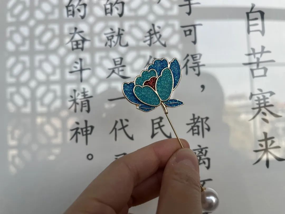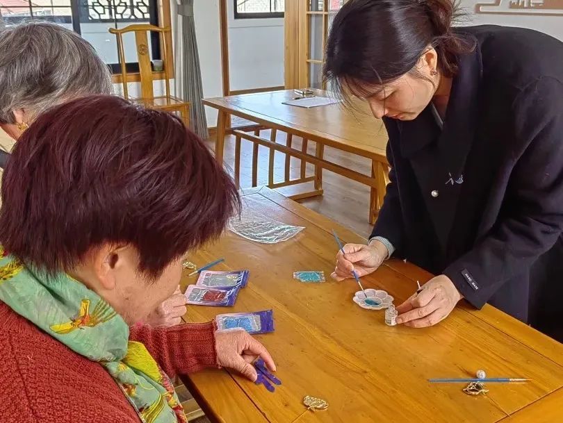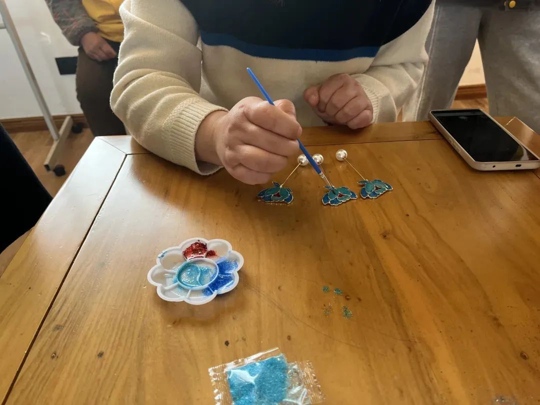 先将胶与彩砂混合好后,用画笔蘸取颜料,小心地填充在未上色的地方。老师提醒居民:“不要在颜料中加入太多的水,这样容易串色,做出来的胸针就没有那么漂亮。”大家将颜料点到圈定的区域内,随着色彩的逐渐丰富,画面也愈加生动,待附着表面的色膜干透后,胸针恰似穿越时空,晶莹剔透的光泽散发着古典的美。