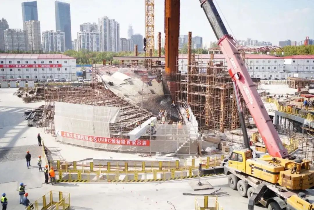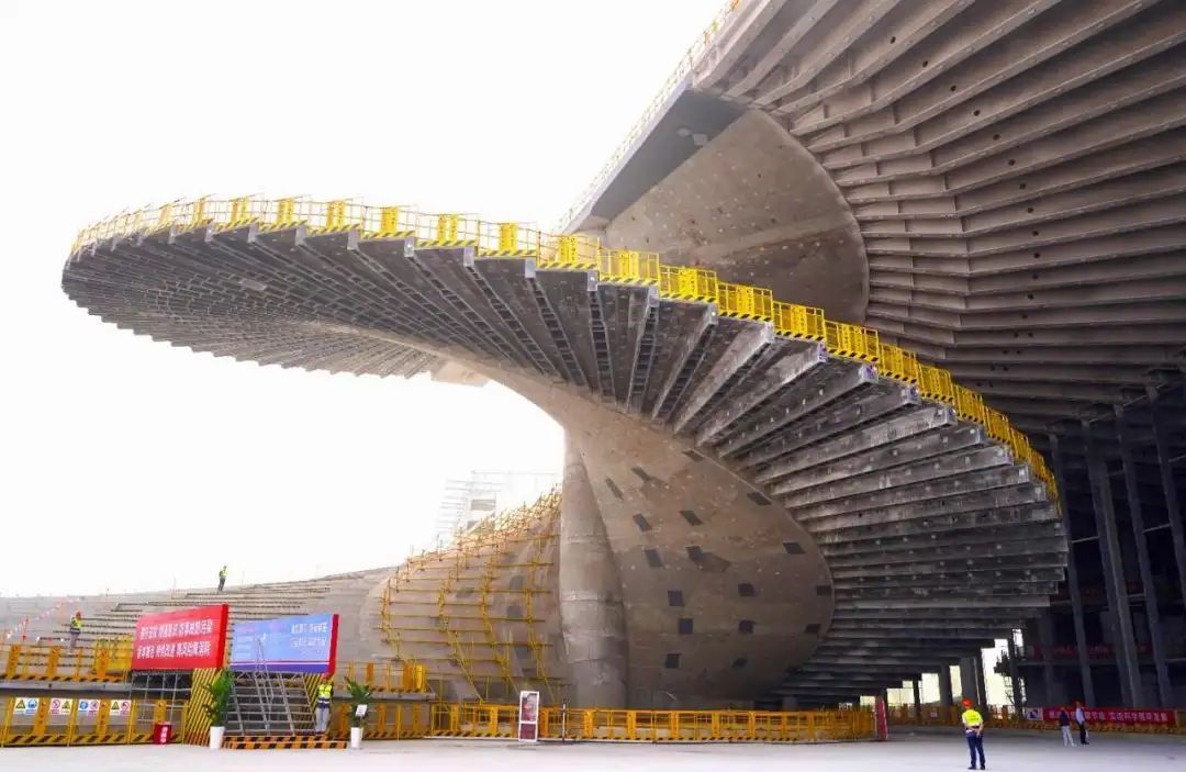 核心区外圈的15米超长、强度达150MPa的UHPC(超高性能混凝土)悬挑预应力梁板,此前,这种新型材料从未在建筑结构中,作为大规模受力构件使用过;核心区内圈厚1.5米的现浇双螺旋自由曲面混凝土厚壳,这项工艺在业内同样没有任何经验可借鉴。从2021年6月成立UHPC攻关小组到2023年7月实现核心区封顶,共历时两年完成攻关和建设。