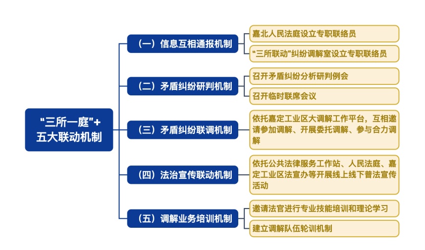 “五大机制”正式确立,为基层综合治理添砖加瓦 作为首个运用“三所一庭+”机制成功审结的家事案件,“三所一庭+”相关部门间互通有无、鼎力协作,遇到矛盾纠纷联合调解,既节约了人力物力,也对矛盾纠纷化解起到了事半功倍的作用,充分体现了此项机制在促进辖区平安建设过程中的积极作用。 截至目前,在嘉定区人民法院及嘉定工业区的大力支持下,“三所一庭+”已经建成五大联动机制。 一事了,数案结。随着社会的快速发展,基层治理逐渐成为促进和谐社会关系、实现民生保障、维护社会稳定的重要手段。建设“三所一庭+”机制,有机整合人民法庭与司法所、派出所、律师事务所等多元解纷主体深入协同参与社会综合治理,可充分发挥庭所共建在化解社会矛盾和诉源治理中的作用,更有效地为社会稳定和经济发展大局服务。